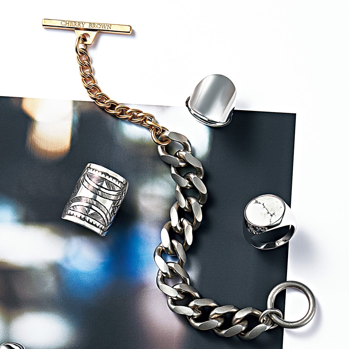 サークルのプレートが指に寄り添う、上品デザイン。リング¥13,200(cofl by 4℃/エフ・ディ・シィ・プロダクツ)白とグレーのマーブル模様が目を引くハウライト。リング¥58,300(マリハ)異なるチェーンを組み合わせ手元にリズムを。ブレスレット¥19,800(チェリーブラウン)ジェンダーレスな雰囲気漂うトライバルモチーフ。リング¥12,100(アダワット トゥアレグ)