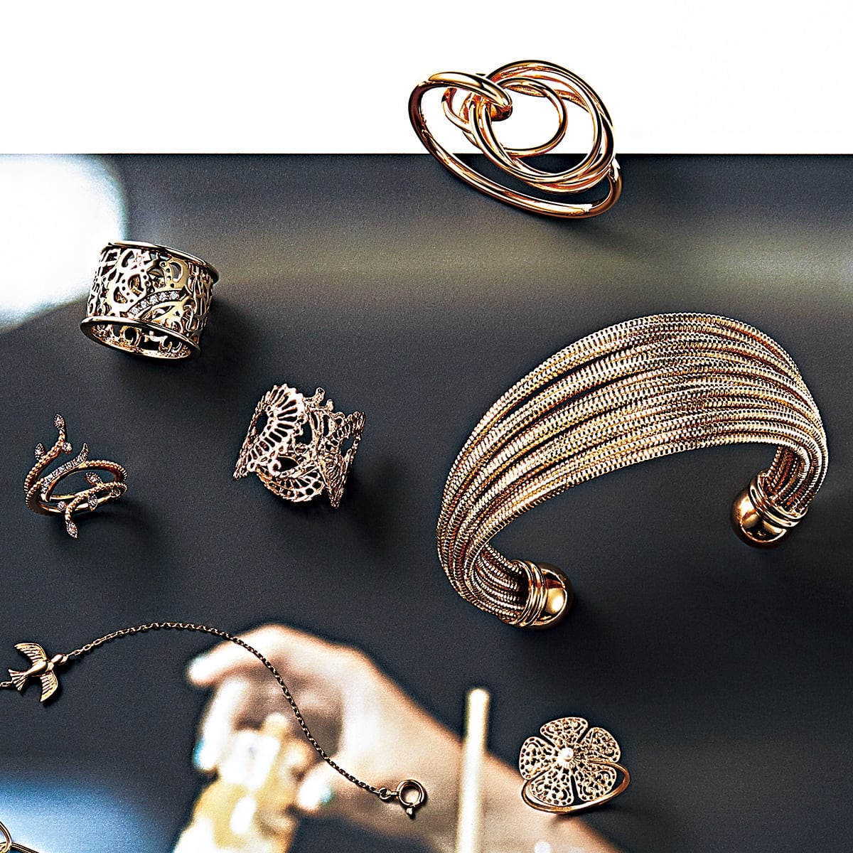 遊び心を効かせた構築美を指元に。ダブルフィンガーリング¥47,300(ジャッド ヴァンチュリ/ウィム ガゼット ルミネ新宿店)彫りを施し立体感を演出。バングル¥25,300(メドゥスィン・ドゥース/goldie H.P.FRANCE)甘すぎず大人に仕上がるマットテクスチャー×パール。リング¥7,700(チェリーブラウン)レースのような透かし柄は、カリグラフィの装飾からインスパイアを受けて。リング¥77,000(カオル 伊勢丹新宿本店)エレガントな透かしのリング。リング¥39,600(ジャスティン デイビス/JACK of ALL TRADESpress room)スパイラル状の茎に、ブラウン系ダイヤモンドの葉モチーフを。リング¥27,500(アルティーダ ウード)