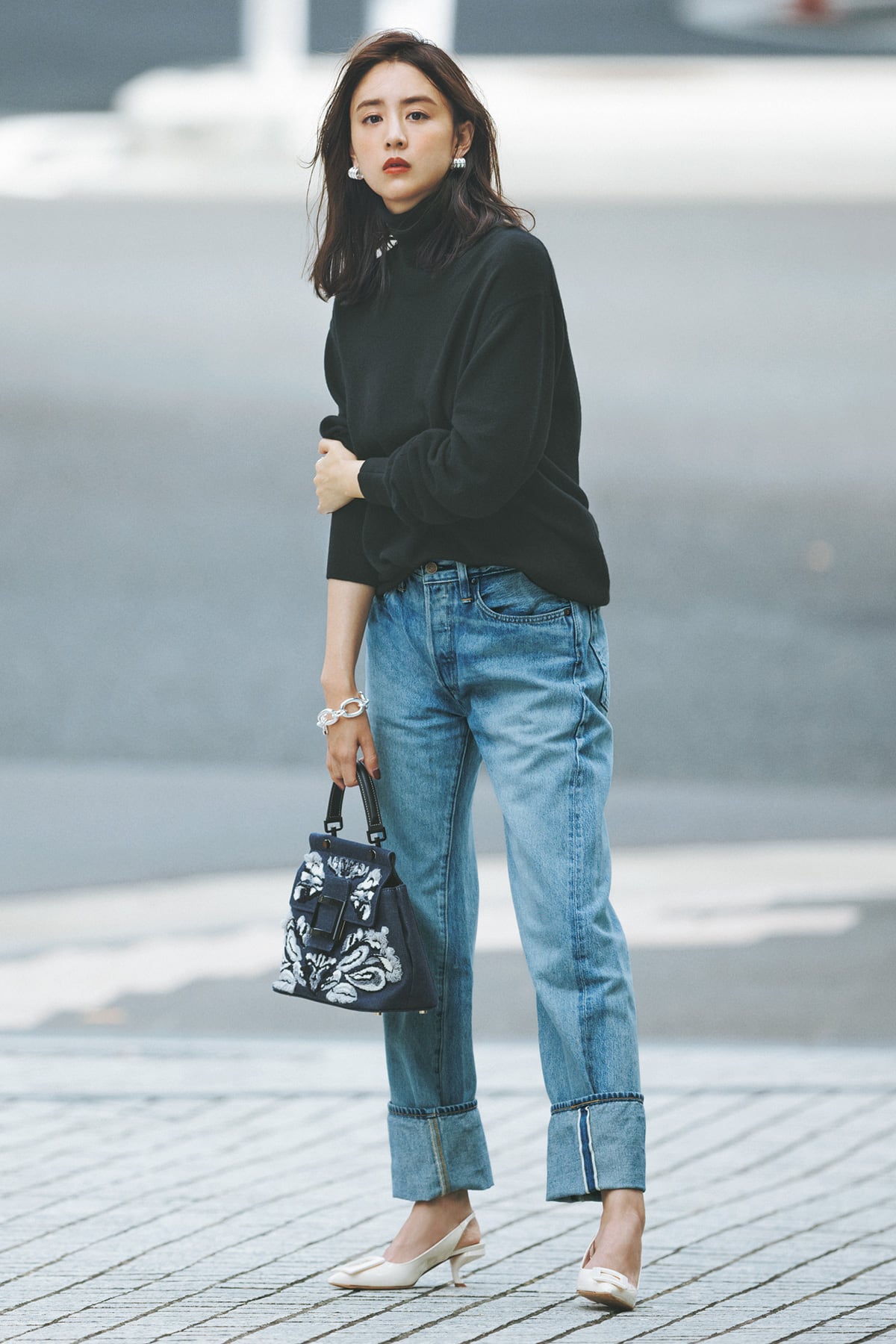 今の気分をさりげなく盛り込んで着こなしたい、デニムとざっくりタートルという王道アイテム同士の掛け合わせ。ボーイッシュさも感じられるからこそ、ヒールやワンハンドルバッグなど、女性らしい小物とアクセで大人なムードに引き寄せるのが正解。デニムパンツ¥25,300(リーバイス® ビンテージ クロージング/リーバイ・ストラウス ジャパン)ニット¥50,600(スローン)バッグ¥427,900パンプス¥116,600(ともにロジェ ヴィヴィエ/ロジェ・ヴィヴィエ・ジャパン)ピアス¥11,000ブレスレット¥13,200(ともにワンエーアールバイウノアエレ/ウノアエレ ジャパン)