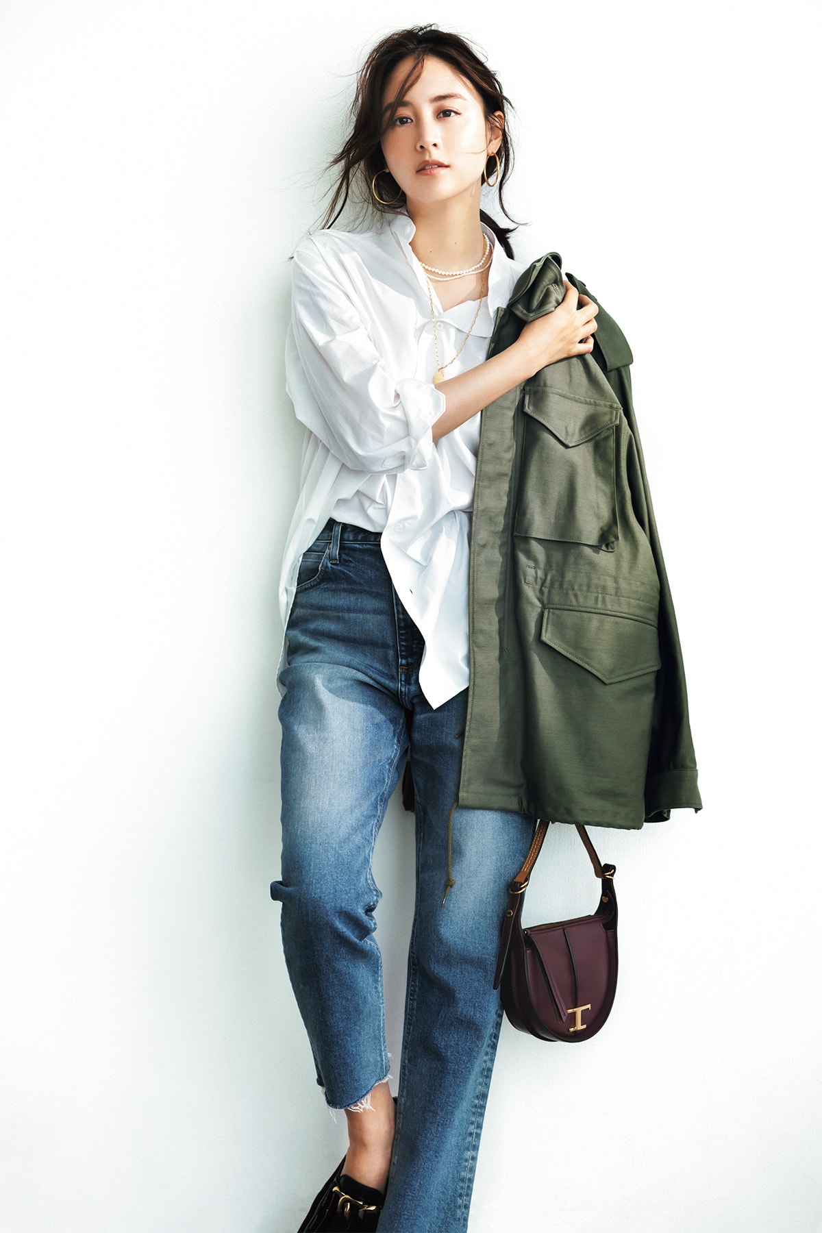 無造作に、さらりと袖を通したバンドカラーシャツにはカットオフデニムがよく似合う。ストールのように軽く羽織ったミリタリージャケットで、潔さの中にひと手間感を漂わせて。デニムパンツ¥31,900ジャケット¥41,800(ともにハイク/ボウルズ)シャツ¥36,300(ロエフ/ユナイテッドアローズ 原宿本店)バッグ¥169,400ローファー¥106,700(ともにトッズ/トッズ・ジャパン)ピアス¥30,800パールネックレス[大]¥46,200[小]¥41,800コインネックレス¥28,600(すべてマリハ)