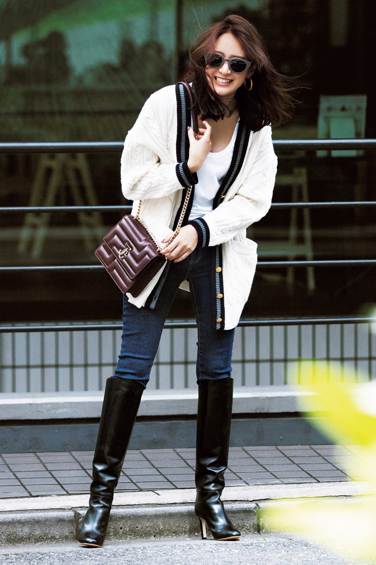 本格的にリバイバルを果たしたロングブーツ。デニムをインした切れ味のいいカジュアルはぜひやってみたい!スレンダーなシルエットで、スタイルアップもお手のもの。デニムパンツ¥20,900(レッドカード トーキョー/ゲストリスト)カーディガン¥26,400(トラディショナル ウェザーウェア/トラディショナル ウェザーウェア ルミネ有楽町店)タンクトップ¥9,900(ラグ&ボーン/ラグ&ボーン 表参道店)バッグ¥251,900ロングブーツ¥212,300(ともにJIMMY CHOO)サングラス¥53,900(アイヴァン 7285/アイヴァン 7285 トウキョウ)ピアス¥27,500(ハイク/ボウルズ)