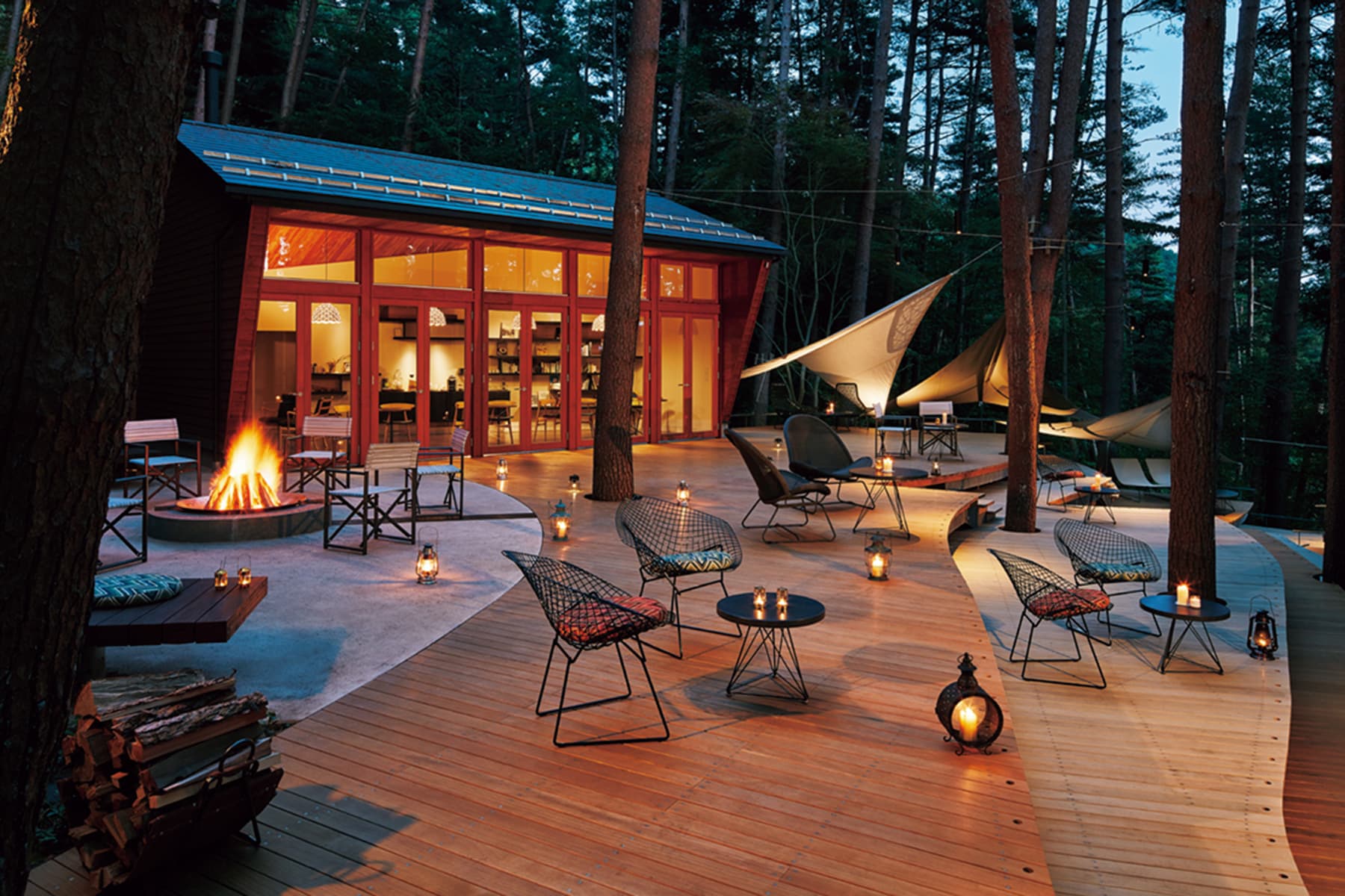 自然を間近に感じられるキャビンは1/3がテラスリビングソファ、焚き火を楽しめるファイアスペースもあり。ジビエが楽しめる、山の幸にフレンチのエッセンスを加えたコース料理も魅力です。