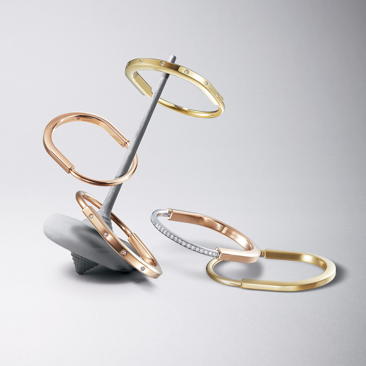 ダイヤモンドをあしらったスタイル、メタル素材だけのスタイル、異なるゴールドのミックス…様々なバリエーションがあるからぜひ試着してしっくりくるものを選んで。バングル「ティファニー ロック」左上から〈YG×D〉¥1,188,000〈RG〉¥852,500〈RG×D〉¥1,188,000〈RG×WG×D〉¥1,628,000〈YG〉¥852,500(すべてティファニー/ティファニー・アンド・カンパニー・ジャパン・インク)