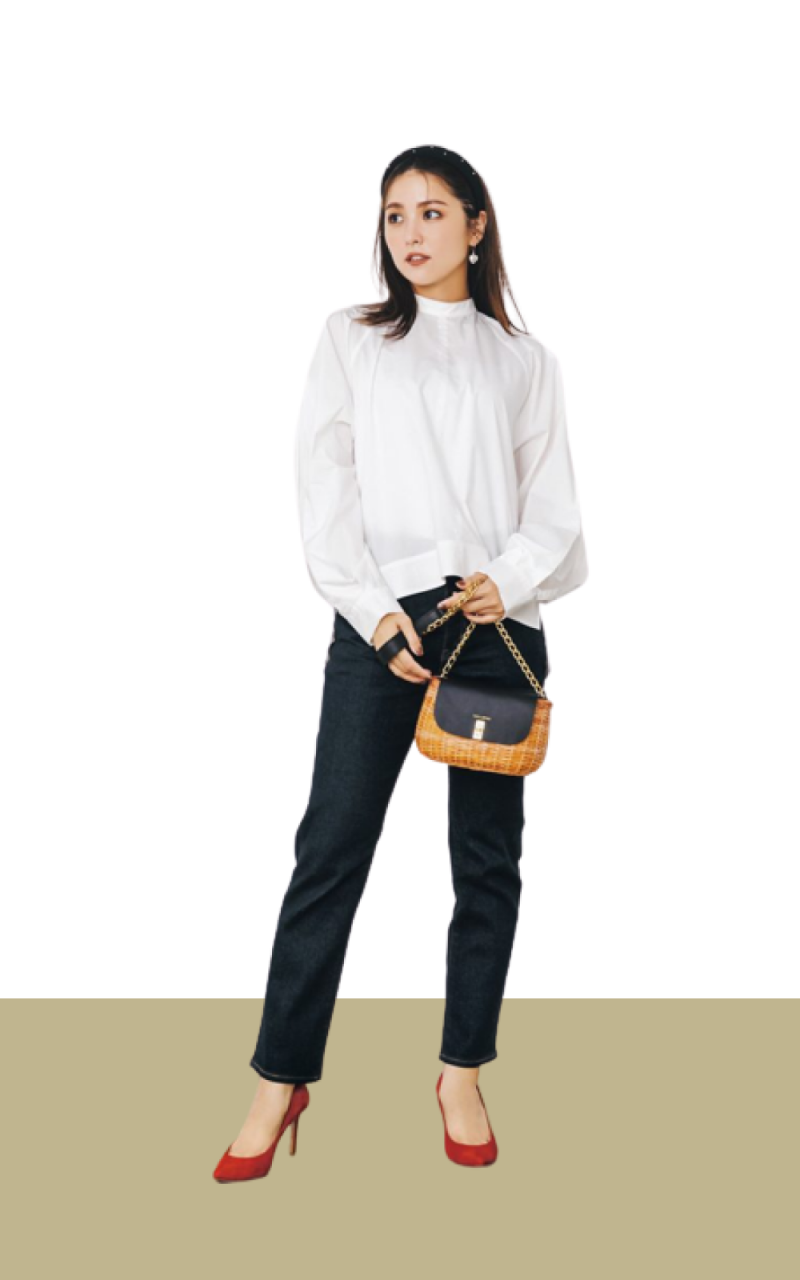パンツ¥2,490(GU)ブラウス¥17,600(MIESROHE)バッグ¥18,700(ヴィオラドーロ/ピーチ)パンプス¥44,000(ロランス/ザ・グランドインク)カチューシャ¥2,475(アネモネ/サンポークリエイト)ピアス¥17,820(パズ コレクティブ/ZUTTOHOLIC)
