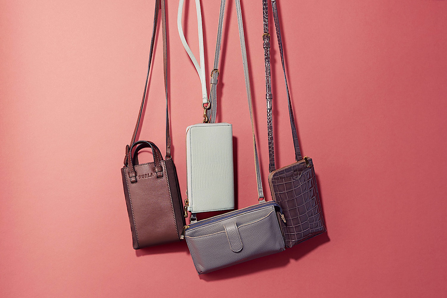 レザーとスエードを組み合わせた、秋冬素材のバッグ。スマホ+αを収納できるサイズで、用途によってストラップを取り外しできます。バッグ¥28,600(FURLA /FURLA JAPAN)