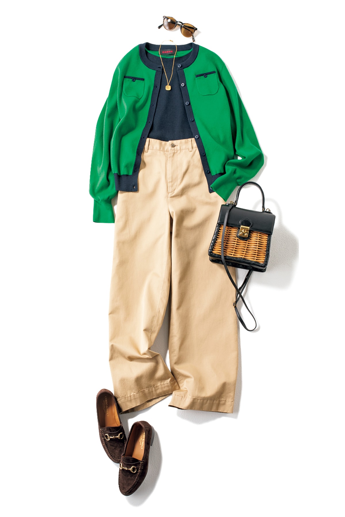 「ノースリニットとのセットで上品に」(西尾さん)カーディガン¥35,200 ノースリーブニット¥20,900(ともにCABaN/CABaN Daikanyama) -