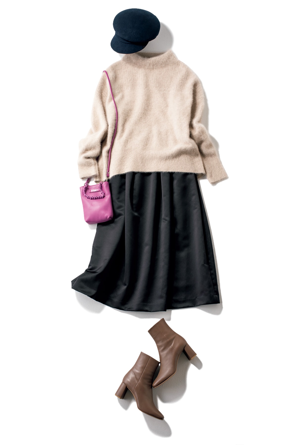 「ふわふわとした素材感は優しげな雰囲気をあと押しします。ベージュは明るめのトーンを」(西尾さん)¥20,900(ジネス/ジネス ペリエ千葉店)