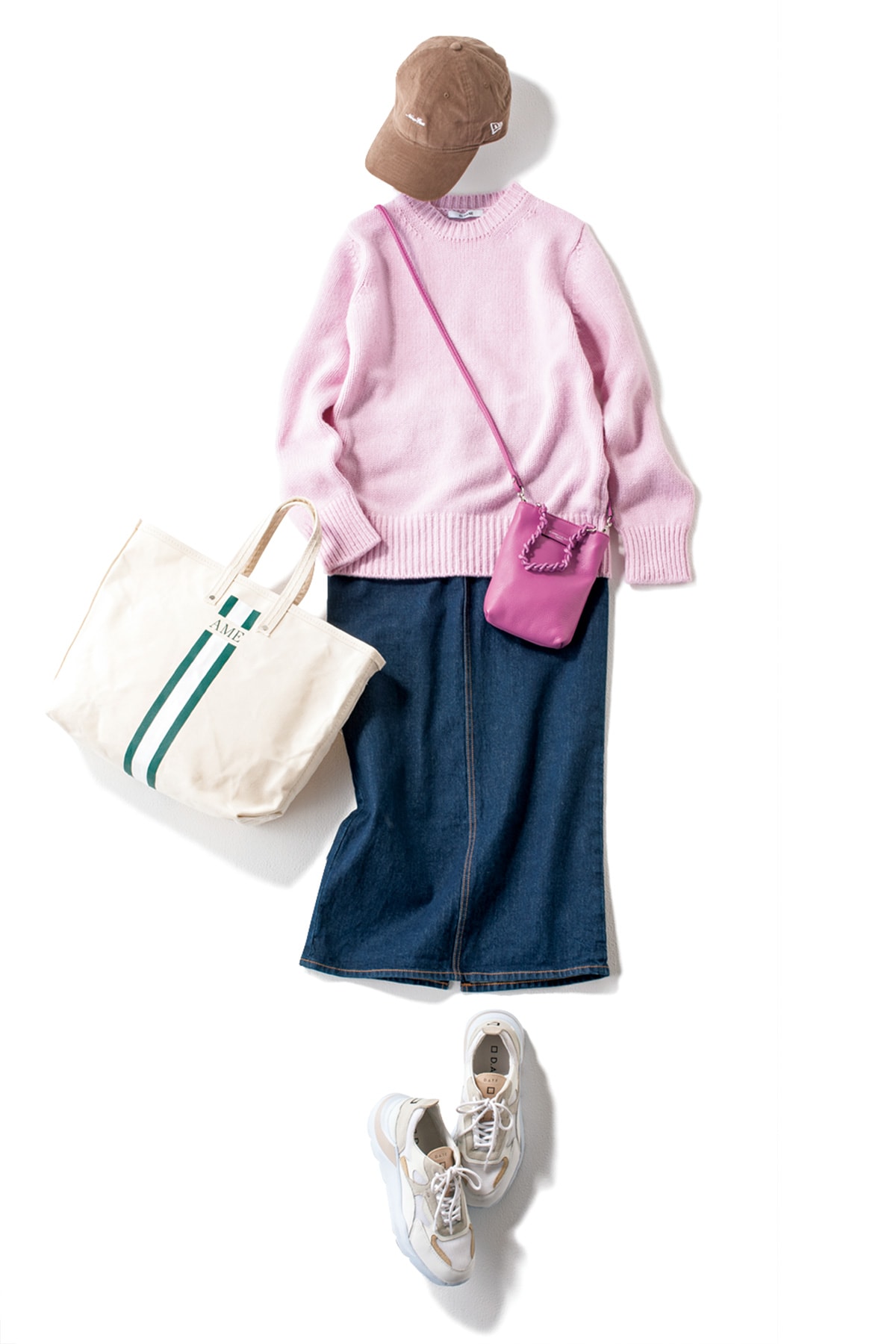 「見た目の印象がぐっと明るくなるピンクは、カジュアルなミドルゲージのニットで取り入れることで甘すぎ防止に」(西尾さん)¥42,900(スローン) -