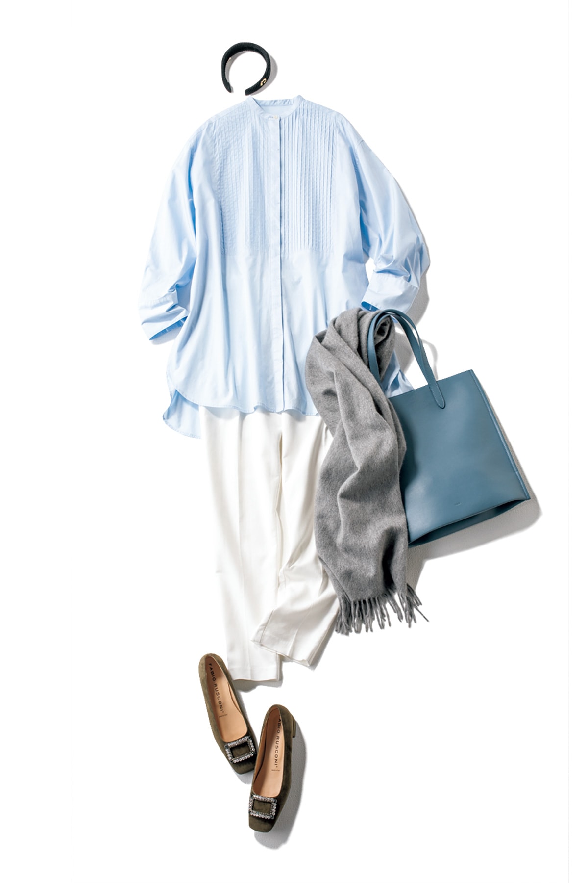 「ライトトーンのブルーのシャツは清潔感があって好感度大。スタンドカラーはスッキリとしたネックラインに」(西尾さん)¥15,400(AKTE)