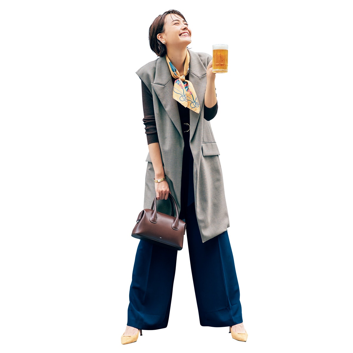 無地よりも洒落感があって、意外とどんな服にも合わせやすい、さりげないチェック柄のジレが今季イチオシ。パワーショルダーのマニッシュなシルエットも今っぽくてこなれています。ニット、ワイドパンツ(着回し)ジレ¥49,500(DES PRÉS/DES PRÉS)スカーフ¥14,300(マニプリ)バッグ¥38,500(OSOI/マルティニーク ルコント ルミネ有楽町)パンプス¥52,800(ペリーコ/アマン)パールイヤリング¥6,600(アルアバイル)ブレスレット¥8,640(アビステ)