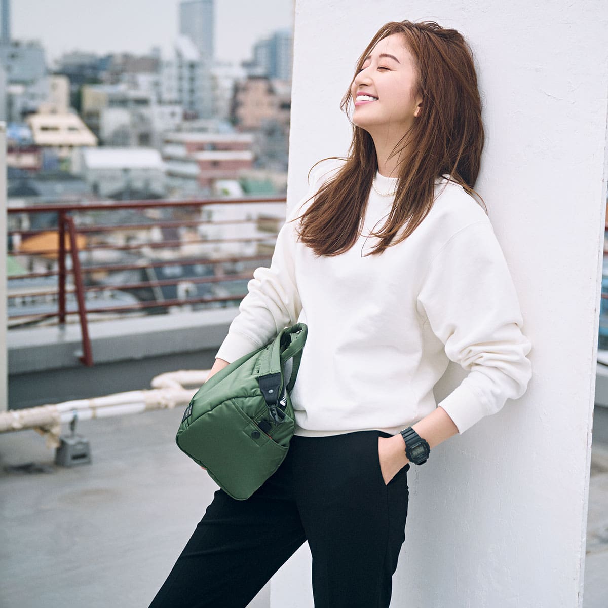 今どきのオフィカジに欠かせないスウェットは、ゆるすぎない、コンパクトに着られるものが◎。白の清潔感を味方につけて、程よくラフで軽快なスタイルが完成!スウェット¥19,800(コーメ/ビューティー&ユース ユナイテッドアローズ 丸の内店)バッグ¥31,350(ポーター/ポーター エクスチェンジ 渋谷)ネックレス¥89,100(ジョン スメドレー/リーミルズ エージェンシー)時計¥15,400(ジーショック/カシオ計算機 お客様相談室)