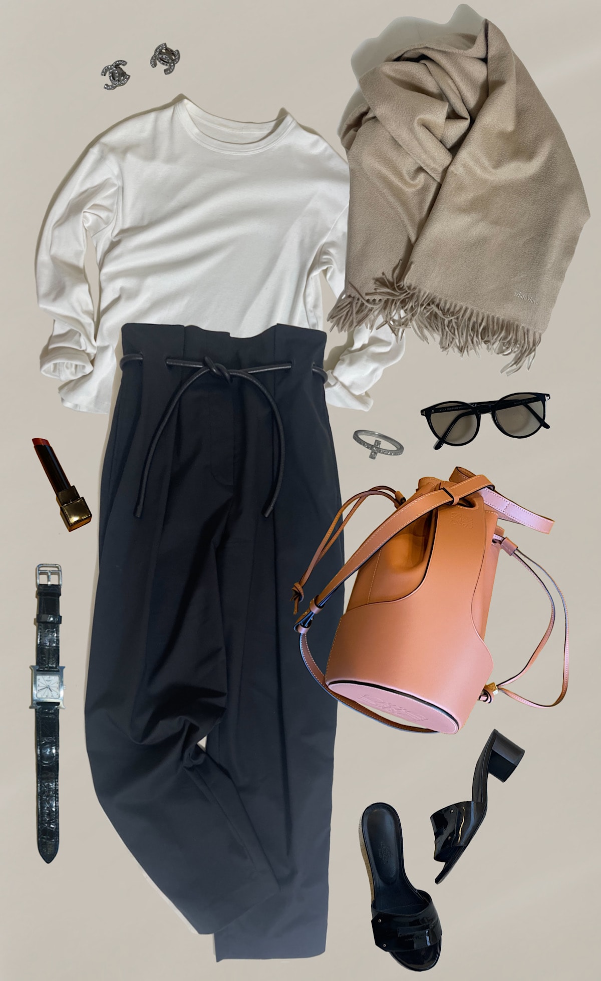 つまらなくなりがちなモノトーンコーデでも、エッジの効いた黒パンツや淡色サングラスを組み合わせれば、シンプルすぎず華やかな印象に。差し色バッグやジュエリーで華やかさを意識して、仕上げに赤リップを添えれば、大人リッチな秋顔コーデの完成です。イヤリング(CHANEL)腕時計・サンダル(Hermès)バッグ(LOEWE)その他(すべてジュニアライター私物)