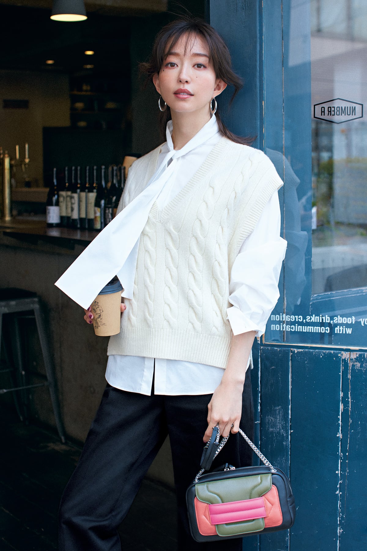 ウール×カシミアの混紡ニットは柔らかく手触り抜群。ゆるっとした今っぽいシルエットでも王道のケーブル編みだからトレンドに傾きすぎない。ニットベスト¥34,100(ポロ ラルフ ローレン/ラルフ ローレン)ブラウス¥20,900(ユナイテッドアローズ/ユナイテッドアローズ渋谷スクランブルスクエア店)パンツ¥25,300(アストラット/アストラット新宿店)バッグ¥128,700(ピエール アルディ/ピエール アルディ東京)ピアス¥5,460(アビステ)