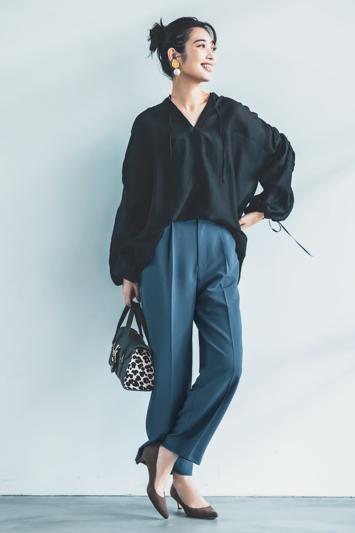 オフィスシーンでも、浮かずに落ち着いたブルーのタックパンツ。さらりとした素材で、どんな体型にも合いそうなセミワイドなシルエットです。メンズライクなボトムとも好相性なブラウスは、袖口の紐で絞り具合が調節可能なデザイン。シアーギャザースリーブブラウス¥6,980ワイドパンツ¥6,930(ともにCITEN/ユナイテッドアローズ カスタマーサービスデスク)バッグ¥19,800(ダイアナ/ダイアナ銀座本店)パンプス¥8,910(マミアン/マミアン カスタマーサポート)イヤリング¥10,890(メルセデス サラザール/ZUTTOHOLIC)