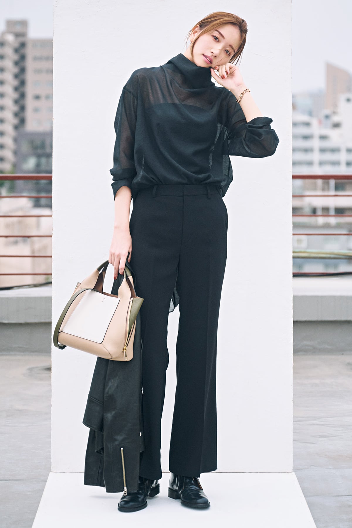 黒に徹するなら、のっぺり重くならない計算がマスト。まだ寒くないこの時期、透け感のあるブラウスで立体感のあるオールブラックを満喫するのも素敵です。ハイネックでボタンなしのブラウスは今っぽくて洗練見えに一役!ブラウス¥16,500(LE PHIL/LE PHIL NEWoMan 新宿店)ジャケット¥74,800(ティッカ)バッグ¥77,000(FURLA/FURLA JAPAN)靴¥69,300(カチム)時計¥41,800(ココシュニック)インナー/私物