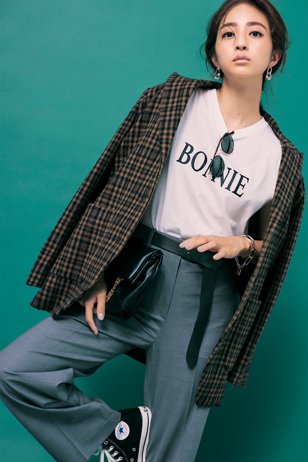 ベルト¥9,990(バナナ・リパブリック)ジャケット¥42,900(デミルクス ビームス/デミルクス ビームス新宿)カットソー¥9,900(アルアバイル)パンツ¥26,400(DESPRÉS)バッグ¥121,000(ザンケッティ/エリオポール代官山)スニーカー¥13,200(コンバース/コンバースインフォメーションセンター)サングラス¥40,700(モスコット/モスコット トウキョウ)ピアス¥7,150 ブレスレット¥11,000(ともにイン ムード/フォーティーン ショールーム)