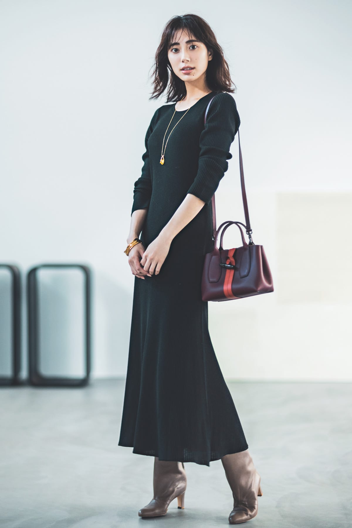 今年注目株の筒形ロングブーツとも相性抜群のフレアシルエット。シンプルデザインとカラーだから、ジャケットやジレなど、幅広いレイヤードでアレンジも可能。また、華美すぎず上品で、仕事帰りのデートにも頼れる一着になりそう。リブニットワンピース¥12,100(Alia/P.weave)バッグ¥83,600(ロンシャン/ロンシャン・ジャパン)ロングブーツ¥97,900(ネブローニ/アッシュプ ラスエリオトロープ)ネックレス¥10,450〈インムード〉バングル¥14,300〈ファシアータ〉(ともにフォーティーン ショールーム)