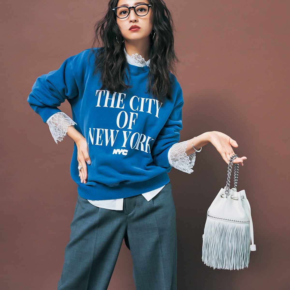 「スウェットとワイドパンツのハンサムなスタイリングを、レースをかませて洒落たムードに。とにかく〝重ねる〟のがマイブーム。ワンツーコーデの潔さよりも、フックのあるスタイリングが楽しいです」。スウェット¥10,450〈グッド ロックスピード〉パンツ¥15,400〈スピック&スパン〉(ともにスピック&スパン ルミネ有楽町店)ブラウス¥26,400(アルアバイル)眼鏡¥39,600(アイヴァン/アイヴァン 東京ギャラリー)ピアス¥38,500 バングル¥63,800 レインボームーンストーンリング¥82,500(すべてマリハ)バッグ¥145,200(J&Mデヴィッドソン/J&Mデヴィッドソン青山店)
