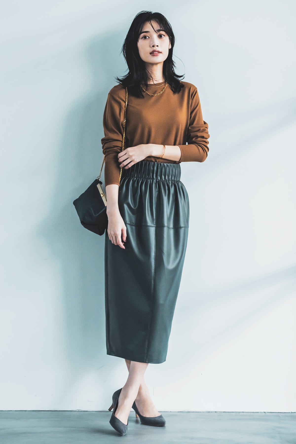 ほどよい光沢のあるスカートは、リサイクル素材を活用し、サステナブルな要素もIN。ニットも上質感が漂い、妥協点を一切感じさせません。ニット¥13,750リサイクルレザースカート¥19,800(ともにMIESROHE)バッグ¥49,500(ブレンテッラ/オデット エ オディール新宿店)パンプス¥15,400(ダイアナ/ダイアナ銀座本店)ショートネックレス¥49,500(アナプノエ/フォーティーン ショールーム)チェーンネックレス¥24,860(チビジュエルズ/チビジュエルズ・ジャパン)バングル¥22,330(ソコ/ZUTTOHOLIC)