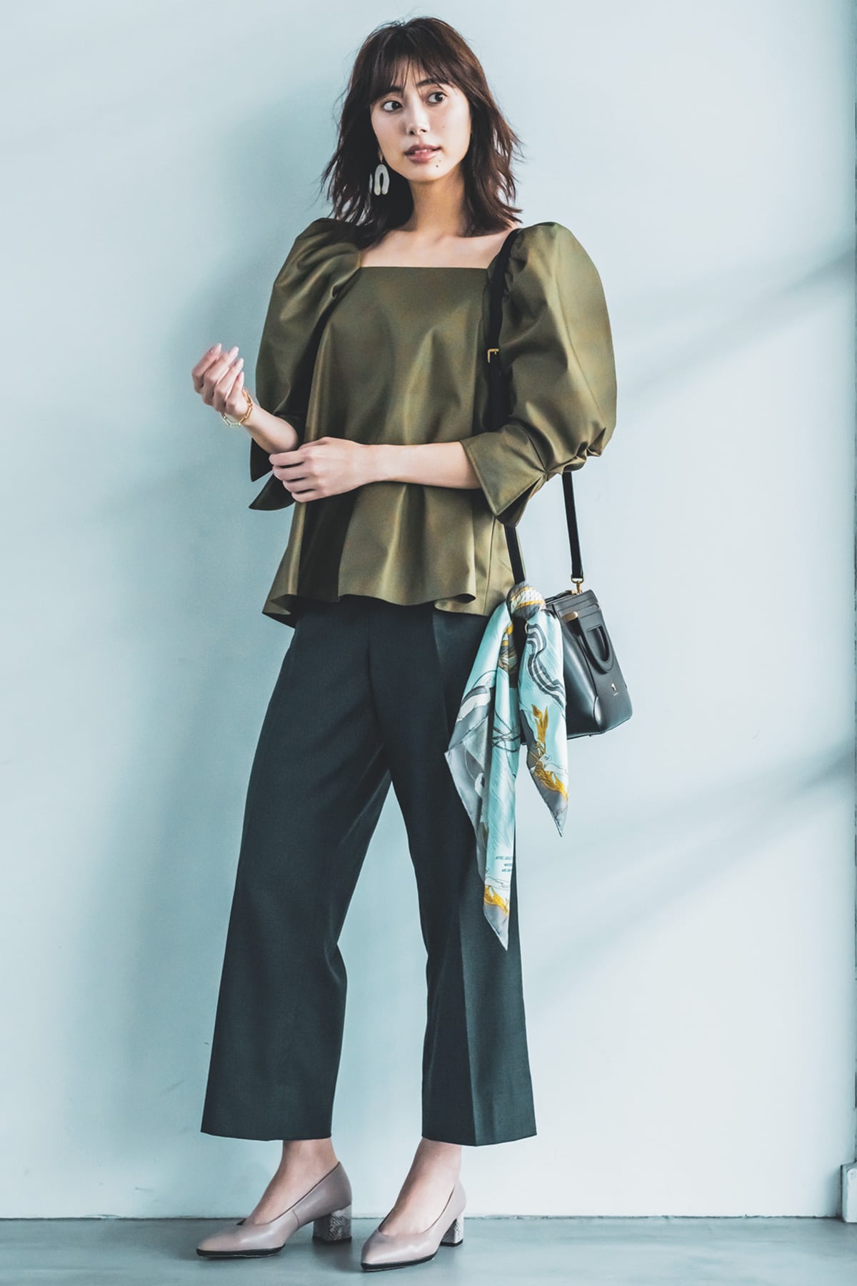 ブラウスの大人っぽいカラーとツヤ感で、上品できちんと感のあるオフィススタイルに。ボトムはシンプルなデザインで、全体のバランスを調整するのがスタイリングのコツ。トップス¥27,500パンツ[サスペンダー付き]¥28,000(ともにシーニュ)バッグ¥46,200(サマンサタバサ/サマンサタバサ ルミネ新宿店)スカーフ¥14,300(マニプリ)パンプス¥14,190(fitfit/fitfit店舗カスタマーサービスセンター)ピアス¥1,760(スリーフォータイム/ジオン商事)ブレスレット¥5,500(ワンエーアールバイウノアエレ/ウノアエレ ジャパン)