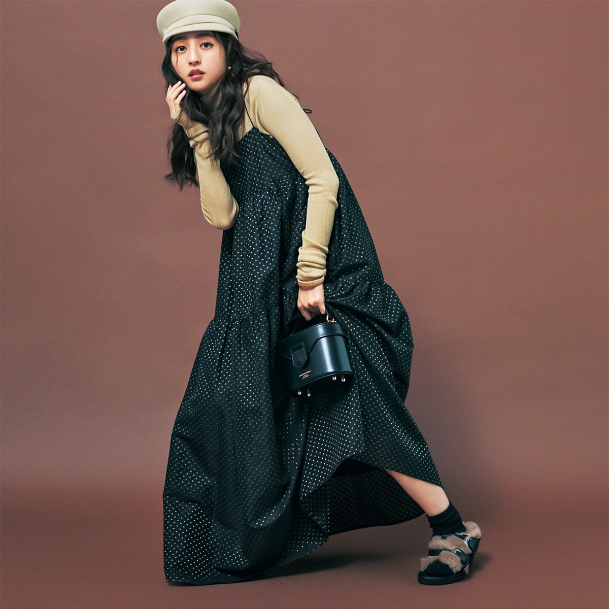 「重みを出したり、カジュアルにハズしたり、足元にポイントをおくバランスが気分。マキシスカートからチラッとのぞかせるくらいなら抵抗なく取り入れられるはず」。ワンピース¥46,200(ヌキテパブラック/TOMORROW LAND)ニット¥6,930(Mila Owen/Mila Owen ルミネ新宿2店)キャスケット¥17,600(ANAYI)ソックス¥1,144(ユナイテッドアスレ/キャブ株式会社)ピアス¥5,400(アビステ)バングル¥19,800(ワンエーアールバイウノアエレ/ウノアエレ ジャパン)サンダル¥26,400(カミナンド/グラビテート)バッグ¥22,000(クリスチャン ヴィラ/デミルクス ビームス新宿)