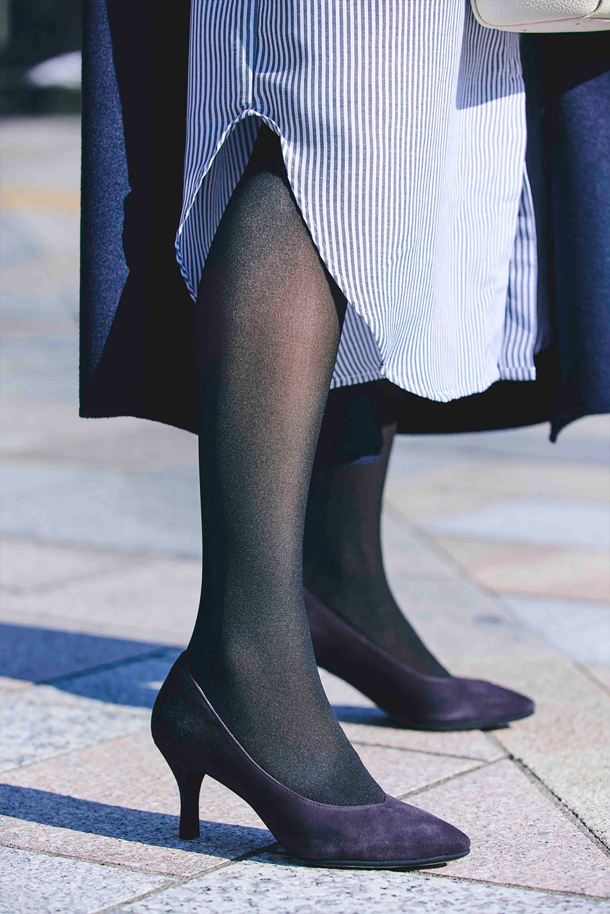 通勤シーンで使いやすい、シンプルなブラック×ベージュ。しっかりデニールなのに自然な陰影によって、脚が細く見えるのも嬉しいポイント。