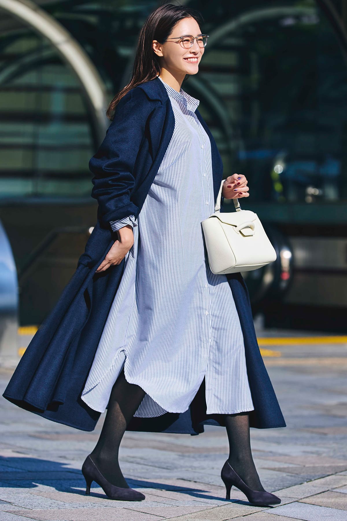 フェイクカラー タイツ 989(ブラック×ベージュ)¥1,100(フランティカ バイ フクスケ/福助)コート¥25,000(PLST)シャツワンピース¥5,990(Isn’t She?)バッグ¥52,800(ヴァジック/ヴァジックジャパン)パンプス¥19,800(ワシントン/銀座ワシントン銀座本店)メガネ[セットレンズ代込み]¥8,800(ゾフ/ゾフ カスタマーサポート)