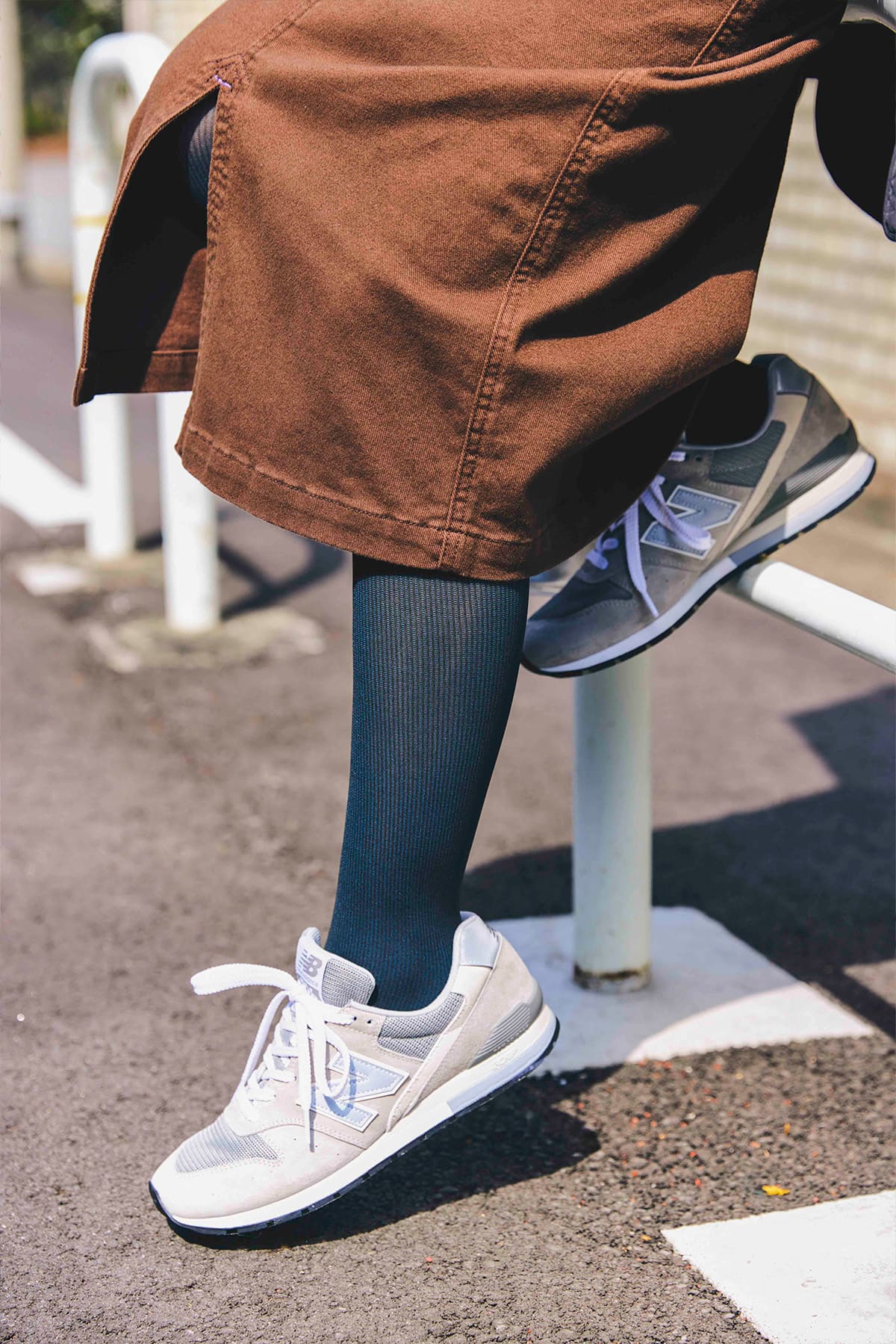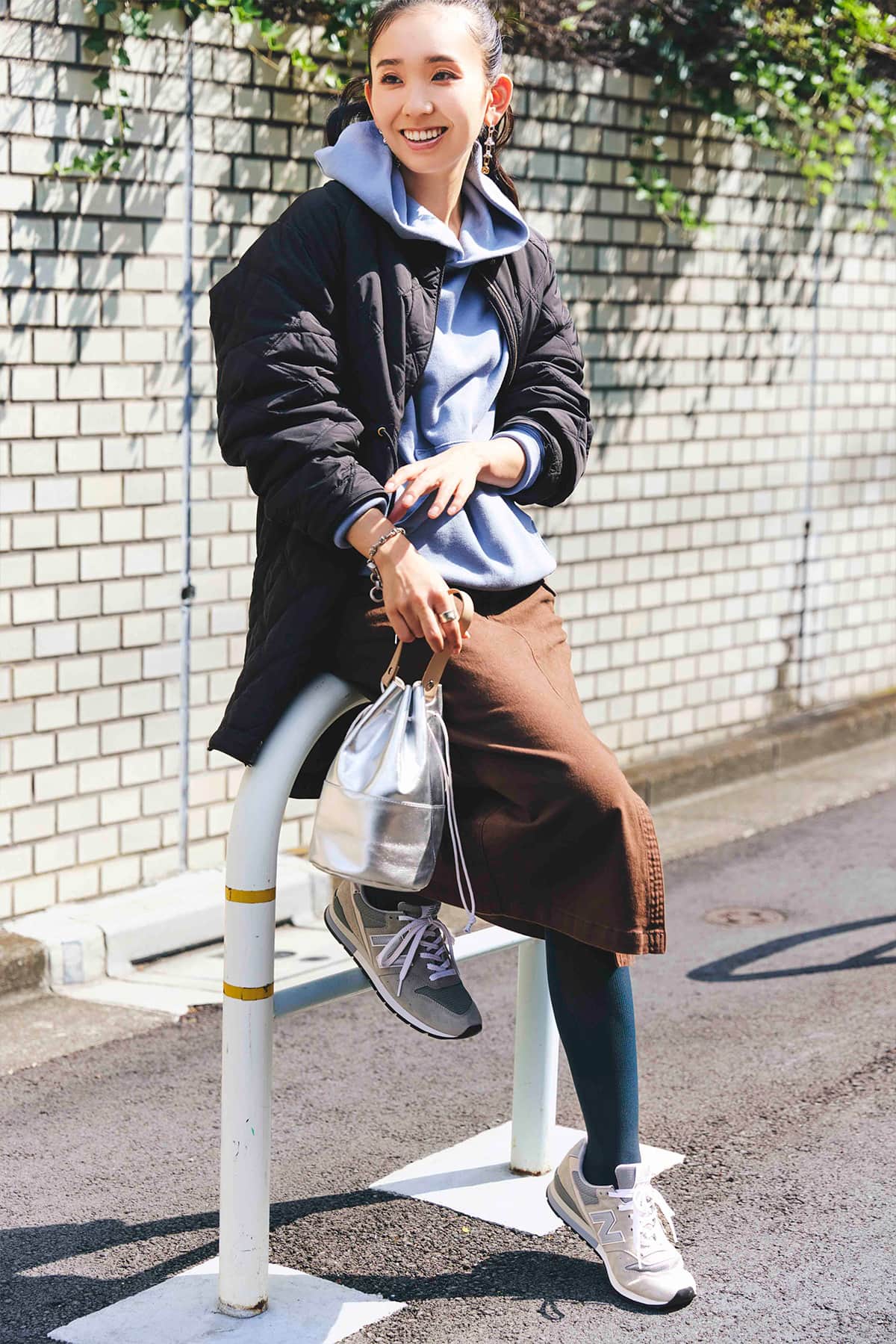 〈タイツ〉フェイクカラー タイツ リブ 990(ブラック×ブルー)¥1,320(フランティカ バイ フクスケ/福助)キルティングジャケット¥17,990(アンフィーロ)フーディ¥14,300(ノーク バイ ザ ライン/クロスプラス)スカート¥6,490(DOUBLE NAME)バッグ¥6,050(マリー・ルイーズ/ラヤン)スニーカー¥15,180(ニューバランス/ニューバランスジャパンお客様相談室)ピアス¥7,150ブレスレット¥7,700<ともにイン ムード>リング¥19,800<オンブル ビジュー>(すべてフォーティーン ショールーム)