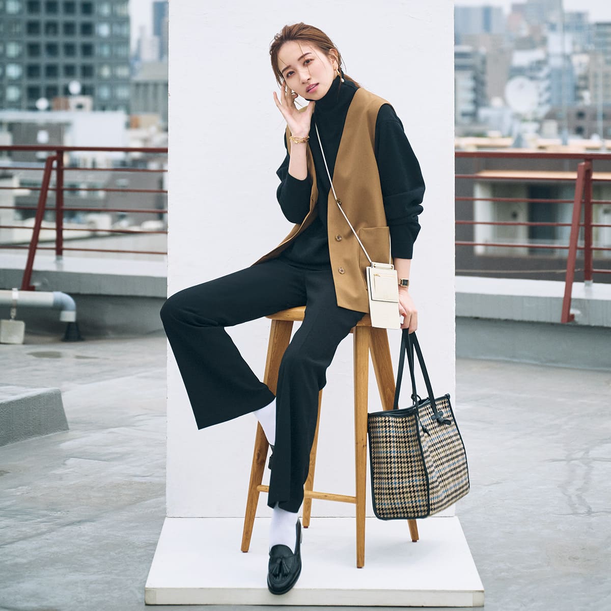 オールブラックに秋色ジレを重ねるだけ、季節上手な着こなしに