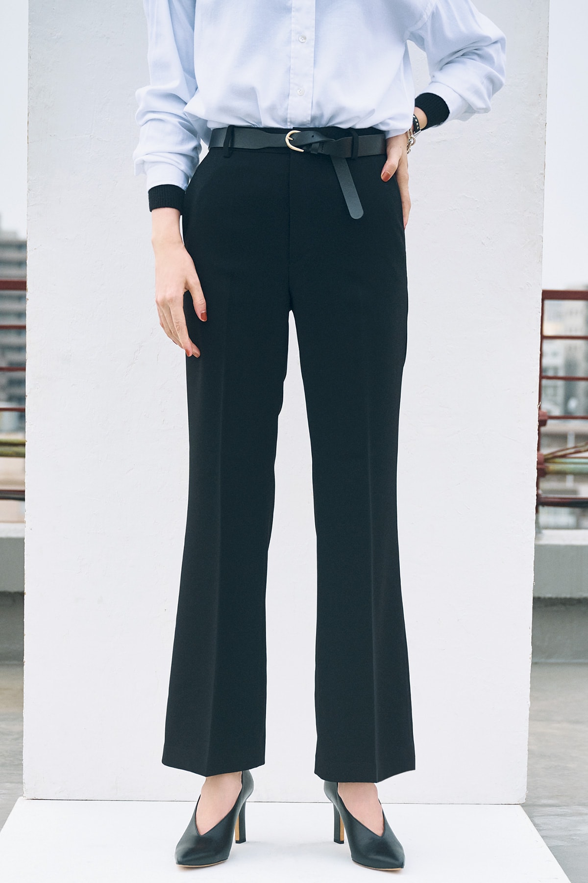 緩やかなフレアシルエットにトップスを選ばないジャストウエストのライズ、きれいな落ち感で高見えする素材…、はまさに優勝黒パン!きちんと感キープで今っぽさもあるから、更新にぴったりの一本です。(スタイリスト・三好 彩さん)