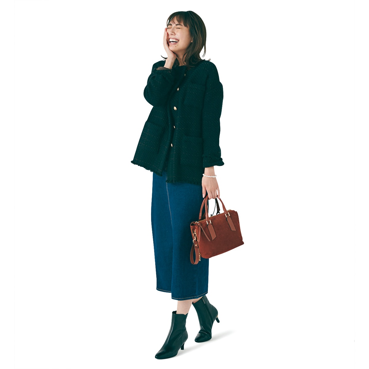 「ノースリニットとのセットで上品に」(西尾さん)カーディガン¥35,200 ノースリーブニット¥20,900(ともにCABaN/CABaN Daikanyama) -
