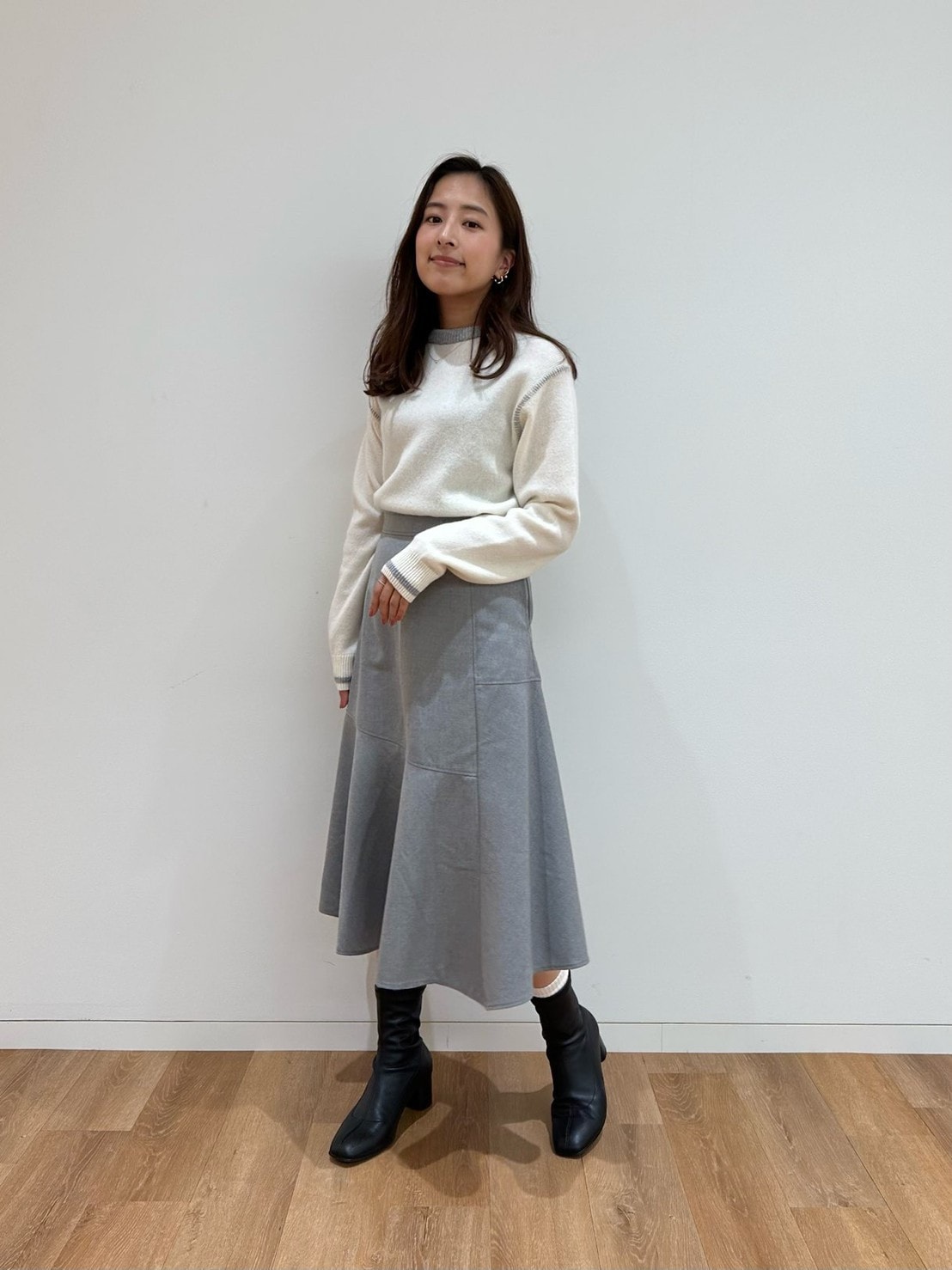 プレミアムラムクルーネックセーター(長袖)¥3,990[Mサイズ着用]フレアスカート¥3,990[Mサイズ着用]ヒートテックデオドラントソックス¥590[男女兼用 25-27着用](すべてユニクロ アンド ジェイ ダブリュー アンダーソン/ ユニクロ)ストレッチショートブーツ¥4,990(ユニクロ)