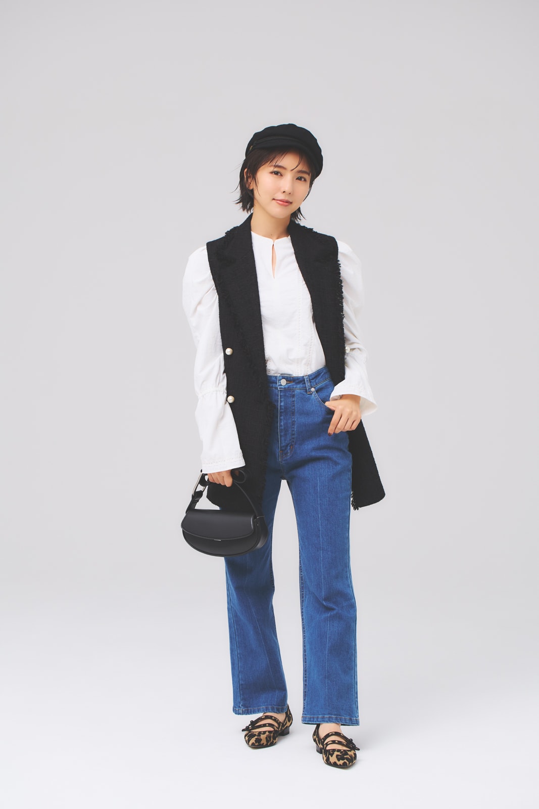 脚を長く見せてくれるハイライズのフレアデニムがSサイズさんの味方に。穿くだけで自然とスタイルアップを叶えてくれるので、デニムコーデが簡単にバランス良くキマります。デニムをカジュアルに見せず、ハンサムに仕立てるのはジレ。つま先が尖ったポインテッドトゥが、全体をスタイリッシュに仕上げます。