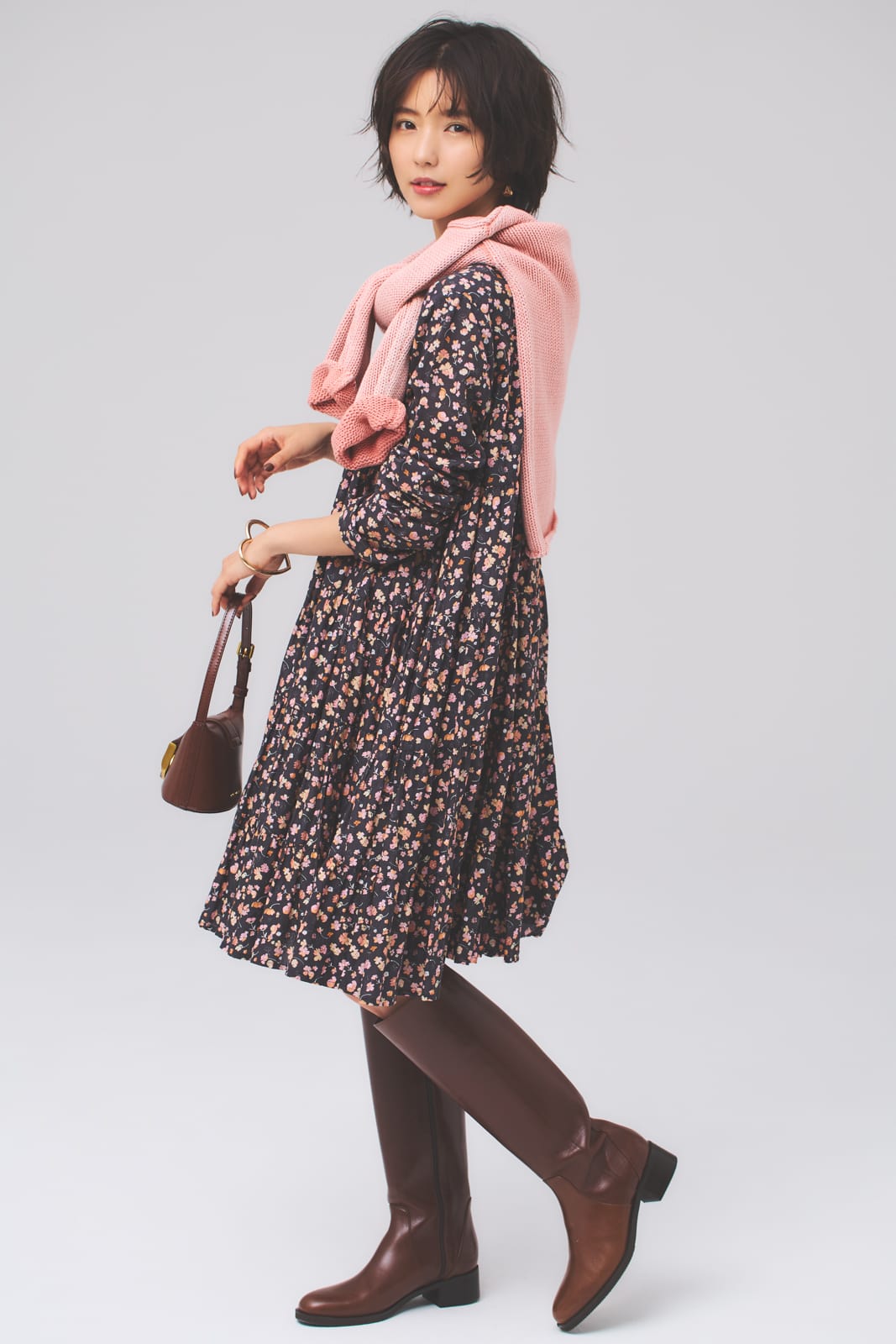 Sサイズさんが柄物をバランスよく着こなす秘訣は、小さめの柄を選ぶこと。全体に散らばるような細かい柄を意識することで、着られている感じを回避して、体にうまくなじみます。裾に向かって広がるAラインシルエットのワンピースには、立体感を演出するニットの肩がけテクが効果的。トレンドのロングブーツは、筒が細めのものを選んで。