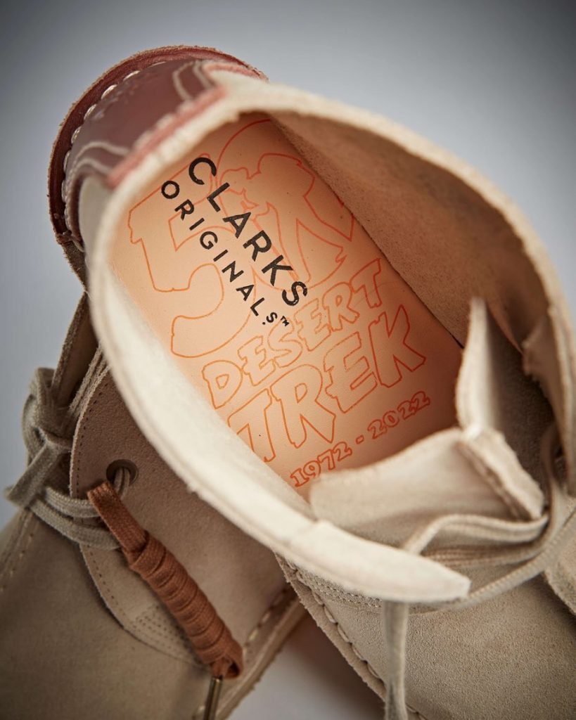 靴の中敷きには 50周年記念のアートワークが施され、周年記念ロゴが入ったシグネチャーフォブつき。また着こなしの幅を広げるシューレースも付属しています。「トレック ハイ 50th」は日本では直営店、公式オンラインストア、他クラークス オリジナルズ取扱店舗にて販売予定です。