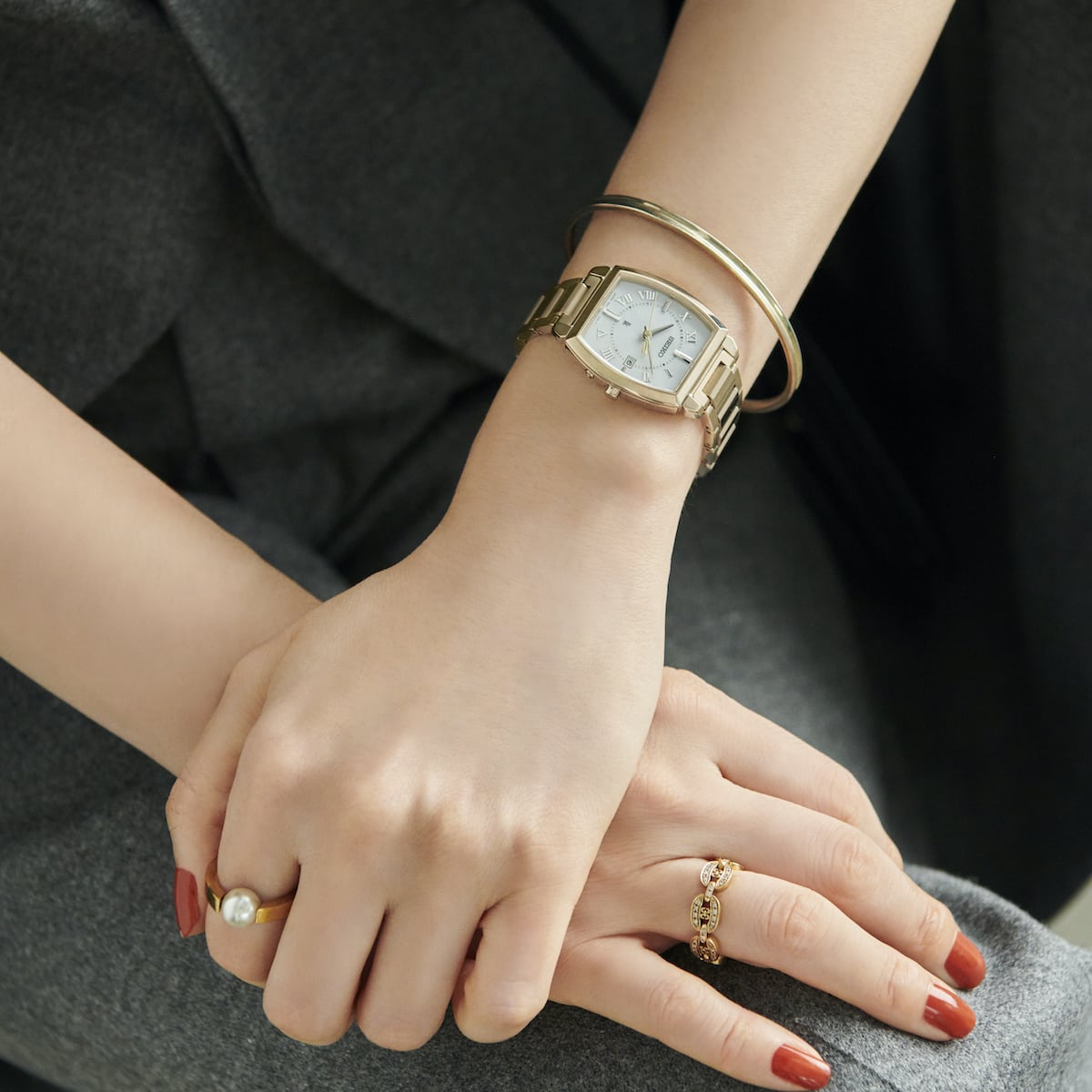 中でも主役になる腕時計は、ラメが輝く文字盤で実用性だけでなく華やかな存在感をアピール。程よく煌めきと女性らしさを表現してくれます。袖口におさまりやすいコンパクトなサイズ感のケース×女性らしい細身のブレスレットは、デイリーにも使いやすい!