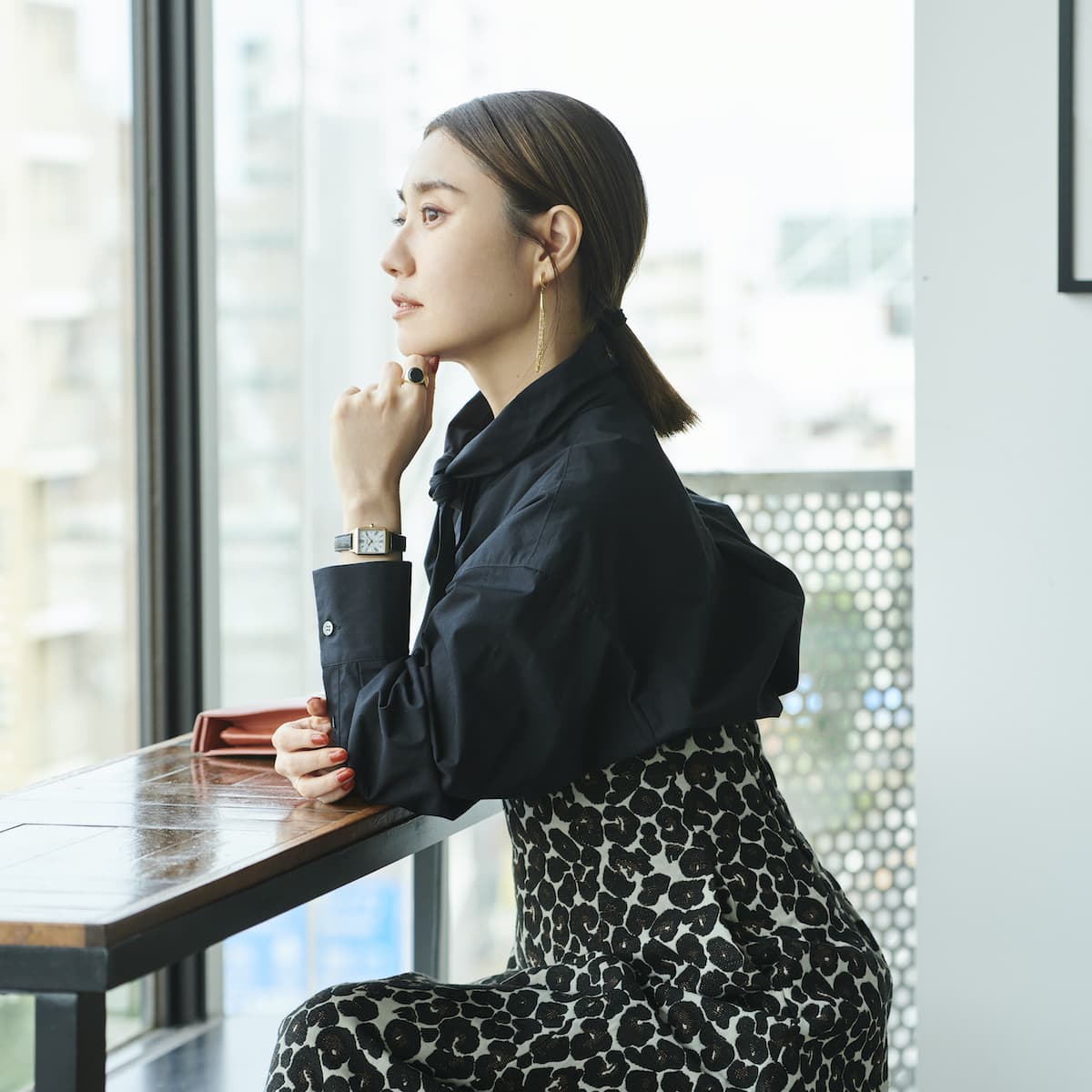 ボウタイブラウスとレオパードスカートで作るどこかレディライクな黒の着こなしが気分の日は、アクセサリーにも黒を取り入れたい。黒レザーのストラップ×シャンパンのような上品ゴールドのケースがクラシカルに映えるスクエア型の腕時計を主役に、オニキスのリングとコーディネートしても相性抜群。ジャケットスタイルなどに品よく馴染むのはもちろん、ラフな休日の装いを格上げするブラックのクロコダイルストラップも素敵!