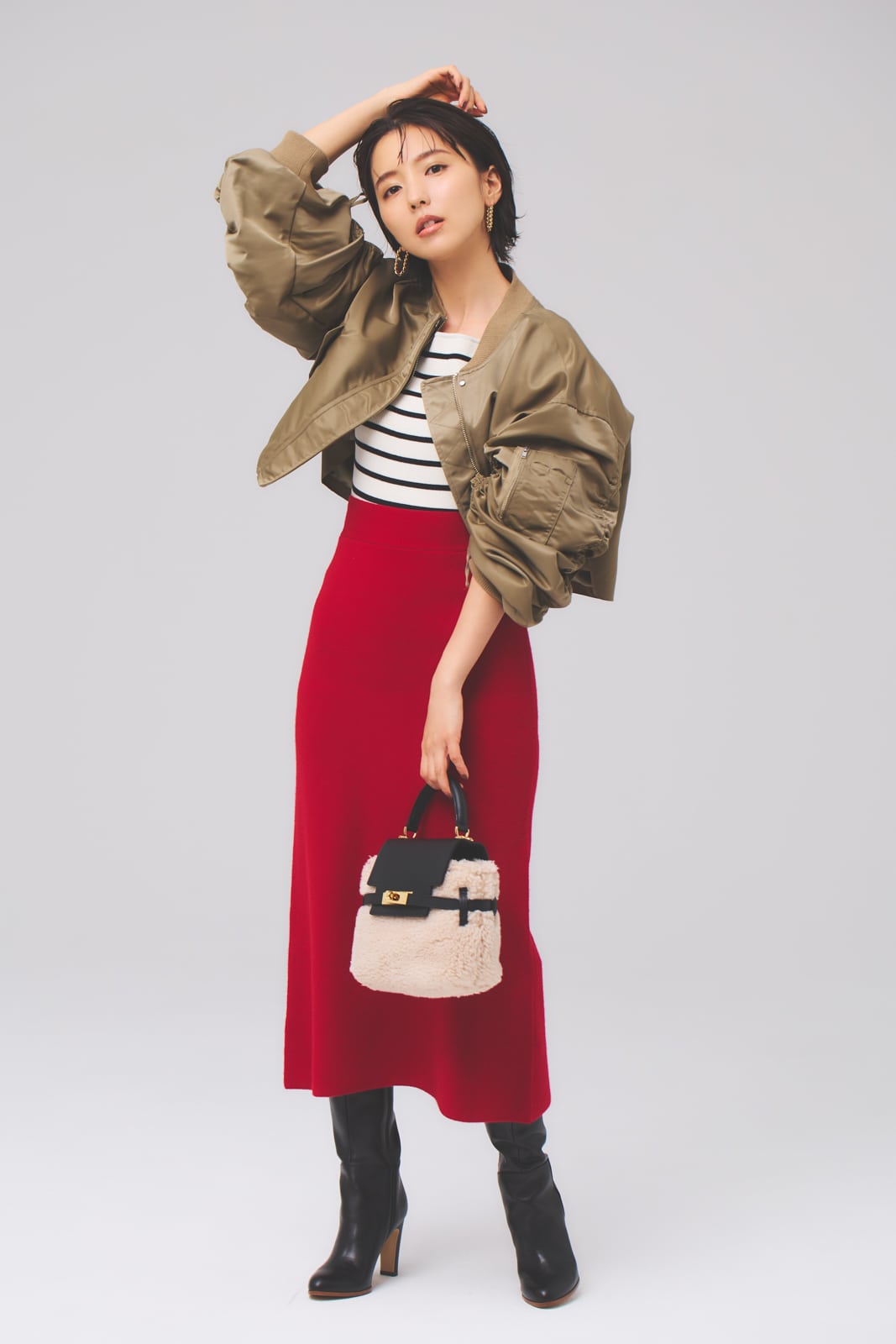 ふくらはぎにかかるくらいのミディ丈スカートがロングブーツとの合わせに好相性。ちょうど脚の細い部分が見える丈感なので、着痩せ効果もばっちりです。ベーシックカラーの装いに映える赤は、今季のトレンドカラーとしても注目。女っぽいニットスカートこそハンサムに仕立てて、バランスよく。