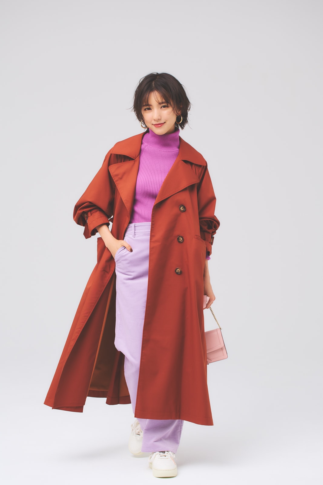 今回はキレイめに着れるトレンチコートを採用。コートの着丈が長い分、肩周りはコンパクトなものを選ぶのが◎。サイズ感、シルエットに関して信頼のおけるSサイズブランドなら、羽織るだけでサマ見えする理想のロングコートが見つかります。それでも体にうまくなじまないときは、コーデの色のトーンを合わせるのが効果的。カラーパレットで隣り合う赤みがかったブラウン、ラベンダー、ピンクを重ねて、まとまりのよい着こなしに仕上げます。