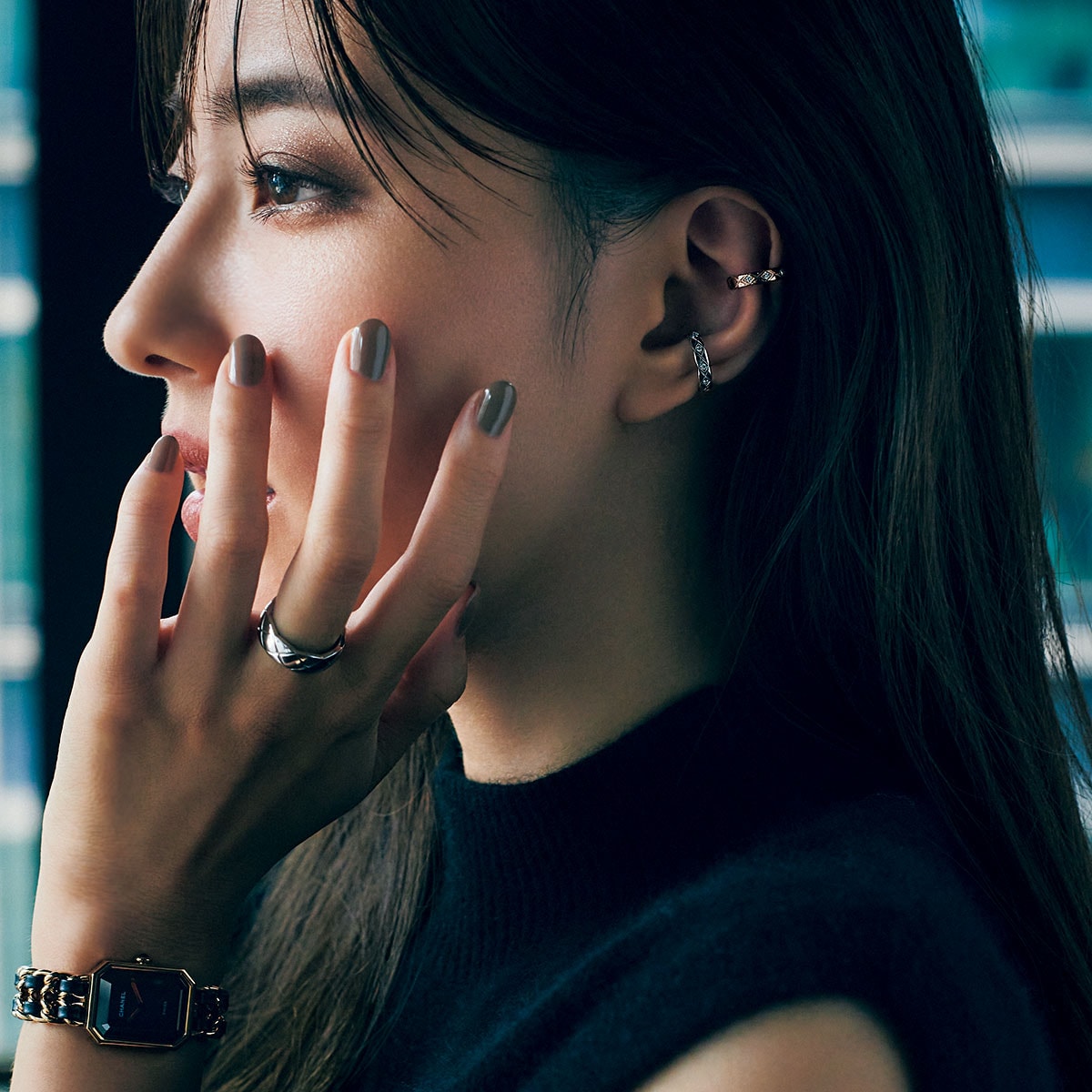 着回しのようにコーディネートできる、充実した素材のバリエーション。イヤカフ上から・「ココ クラッシュ」〈ベージュゴールド×D〉¥269,500〈WG×D〉¥276,100リング〈WG〉¥363,000時計「プルミエール オリジナル エディション」〈SS(ゴールドP VD)×レザー〉¥759,000(すべてシャネル)ニット¥15,400(アルページュ ストーリー)