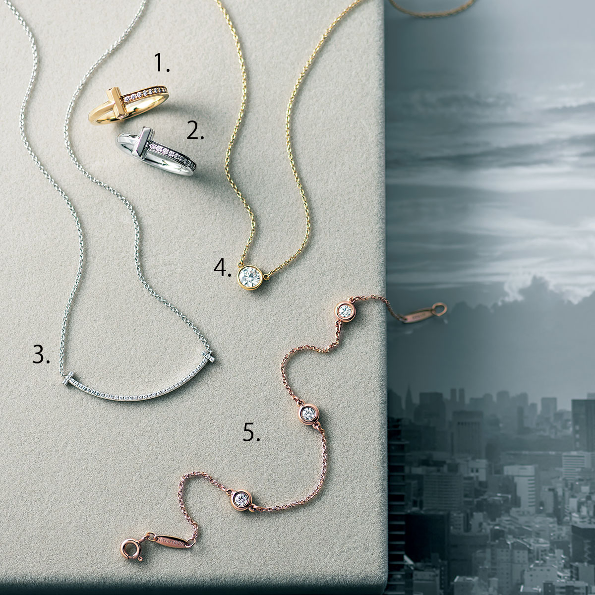 モダンな「T」やスマイルのモチーフが、頑張る私のモチベーションに。「ティファニー T」 1.リング〈WG ×D〉 2.〈YG×D〉各¥275,000 3.ネックレス〈WG×D〉¥357,500 今ちょうど良いものより、5年、10年先の自分を思い描きながら選びたい。「ダイヤモンド バイ ザ ヤード」 4.ネックレス〈YG×D0.05ct~〉¥123,200~ 5.ブレスレット〈RG×D3石計0.3ct~〉¥352,000(すべてティファニー/ティファニー・アンド・カンパニー・ジャパン・インク)