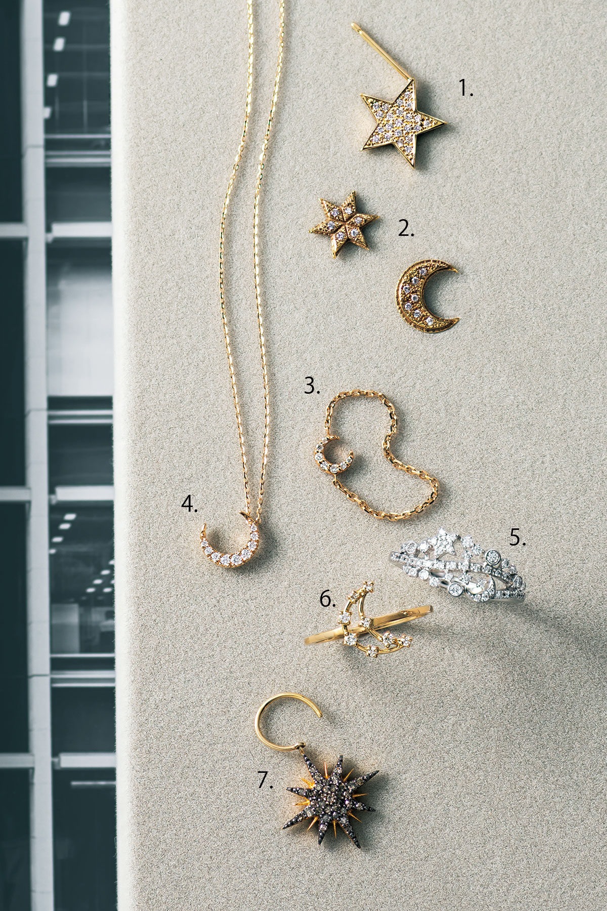 1.星が横顔に映るキャッチーなデザイン。ピアス〈YG×D〉¥132,000(ビジュードエム/ビジュードエム ギンザシックス) 2.星と月、洒落たペアリング。ピアス〈YG×D〉¥83,600(ジジ/ホワイトオフィス) 3.スキンジュエリーにもモチーフを。リング〈YG×D〉¥18,700(ココシュニック) 4.煌めきのグラデーションにより、神秘的な印象に。ネックレス〈YG×D〉¥59,400(スタージュエリー/スタージュエリー表参道ヒルズ店) 5.流れ星のような幻想的な世界観を手元に。リング〈WG×D〉¥198,000(ポンテヴェキオ/ポンテヴェキオ 銀座並木通り本店) 6.月に星屑が舞い降りた、ドリーミーなリング。リング〈YG×D〉¥73,700(アーカー/アーカー 表参道ヒルズ店) 7.優美に揺れる、ヴィンテージライクなブラウンダイヤモンド。ピアス〈片耳用/SV(YGコーティング)×D〉¥25,300(アルティーダ ウード)
