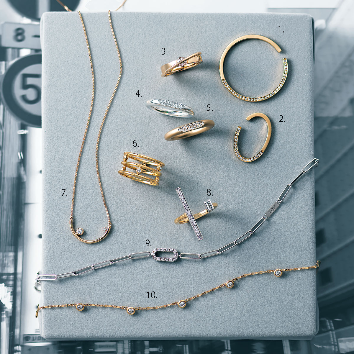 モダンなフォルム×パヴェも現実的な値段設定。1.イヤカフ〈YG×LGD〉¥121,000、2.〈YG×LGD〉¥75,900(ともにプライマル)3.ダイヤモンドの表面を地金が横断する、斬新なデザインもラボグロウンならでは。リング〈YG×LGD〉¥132,000(Terra)ボリュームのあるリッチなデザインを水平にカットし、エッジを効かせて。4.リング〈SV×LGD〉¥52,800、5.〈YG×LGD〉¥110,000(ともにエネイ/ENEY松屋銀座)6.ワイヤーリングの空間をエレガントに彩る煌めき。リング〈YG×LGD〉¥24,200、7.ハーフサークルに大小のダイヤモンドを。ネックレス〈YG×LGD〉¥33,000(ともにcofl by 4℃/エフ・ディ・シィ・プロダクツ)8.クラシカルなバゲットカットとメレの組み合わせ。リング〈YG×WG×LGD〉¥176,000 9.インフィニティチェーンが繋ぐゼロモチーフ。ブレスレット〈WG×LGD〉¥121,000(ともにYON)10.普遍的なデザインに投資するのも素敵。ブレスレット〈YG×LGD〉¥159,500(SJX/SJX W ニュウマン横浜店)