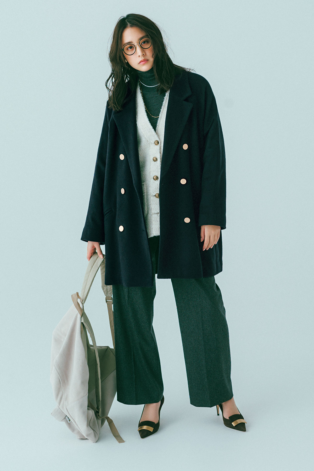 コートでは珍しい金ボタンがアクセント。丸みのあるシルエットにヒップが隠れるちょうどいい丈感で、まさに大人のピーコートと呼べる一着。コート¥61,600ツイードジャケット¥63,800タートルカットソー¥18,700パンツ¥31,900(すべてドゥーズィエム クラス/ドゥーズィエム クラス 青山店)眼鏡¥42,900(アイヴァン/アイヴァン 東京ギャラリー)チェーンネックレス[60㎝]¥17,600パールネックレス[37㎝]¥40,700イヤリング¥74,800(すべてマリハ)パンプス¥113,300(セルジオ ロッシ/セルジオ ロッシ カスタマーサービス)バックパック¥27,500(THIRD MAGAZINE × OUTDOOR PRODUCTS/THIRD MAGAZINE)
