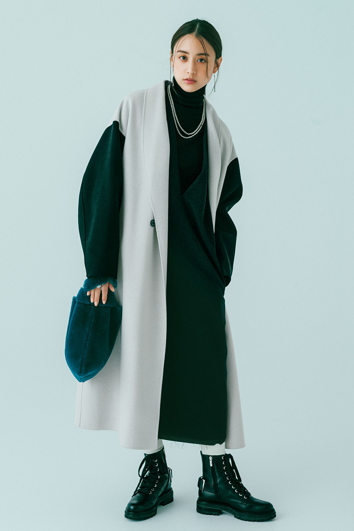着用時の重さや硬さを軽減するため、芯と身頃の裏地をつけず、袖裏のみで仕立てられています。生地の端を手まつりで仕上げることにより、柔らかな表情も。一見クールなアウターに込められた作り手の考え、それを知るのも大人のオシャレの醍醐味。コート¥101,200(ハイク/ボウルズ)ワンピース¥64,900(ラシュモン/アペリア)ニット¥8,470(Mila Owen/Mila Owen ルミネ新宿2店)ソックス¥3,850〈ロンハーマン〉ネックレス¥200,200〈タナーズ インディアン アーツ〉(ともにロンハーマン)ピアス¥121,000(ウノアエレ/ウノアエレ ジャパン)リング¥82,500(マリハ)ブーツ¥181,500(セルジオ ロッシ/セルジオ ロッシ カスタマーサービス)バッグ¥30,800(オーウェン バリー/GALERIE VIE 丸の内店)