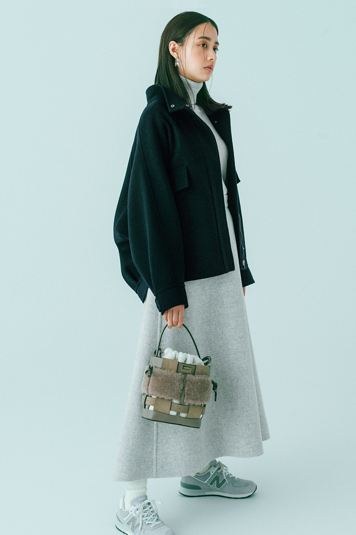 前身頃はドルマンスリーブの続き袖、後ろはラグラン切り替えになっているから、着るだけで抜け感のある佇まいに。ブルゾン¥94,600スカート¥86,900(ともにebure GINZA SIX店)ニット¥24,200(ドローイング ナンバーズ/ドローイング ナンバーズ新宿店)ピアス¥8,800(ワンエーアールバイウノアエレ/ウノアエレ ジャパン)ソックス¥3,850(ロンハーマン/ロンハーマン)スニーカー¥15,290(ニューバランス/ニューバランス ジャパンお客様相談室)バッグ¥159,500(ザンケッティ/エリオポール代官山)