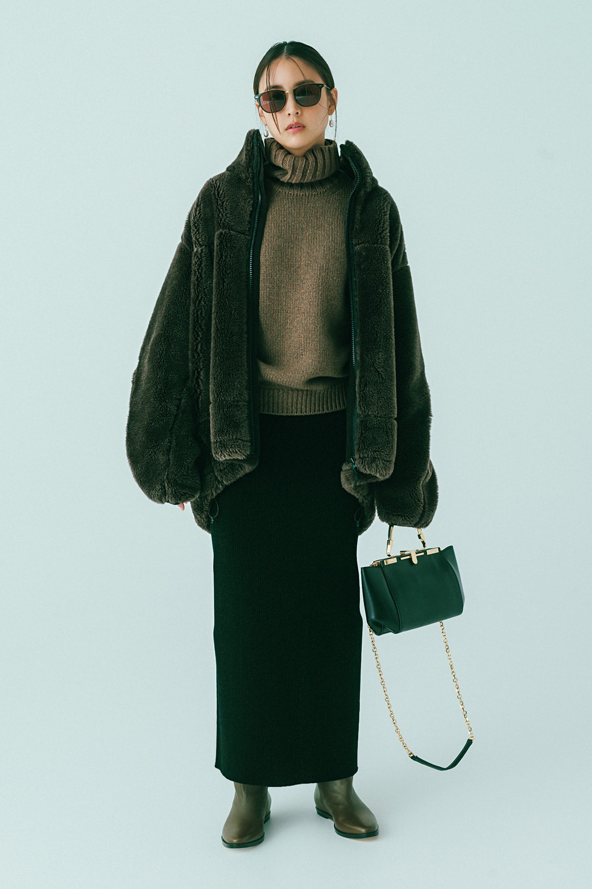 去年大HITのボアブルゾンがアップグレード。保温性がUPし手触りもよりなめらかに。チョコレートみたいなダークブラウンも合わせやすい!キレイめなタイトスカートと合わせた、どこかちぐはぐなバランスが上級者。ブルゾン¥89,100 スカート¥20,900(ともにカオス/カオス表参道)ニット¥36,300(スローン)サングラス¥41,800(アイヴァン/アイヴァン 東京ギャラリー)ピアス¥69,300(マリハ)ブーツ¥88,000(ブレンタ/アルアバイル)バッグ¥170,500(ザンケッティ/エリオポール代官山)