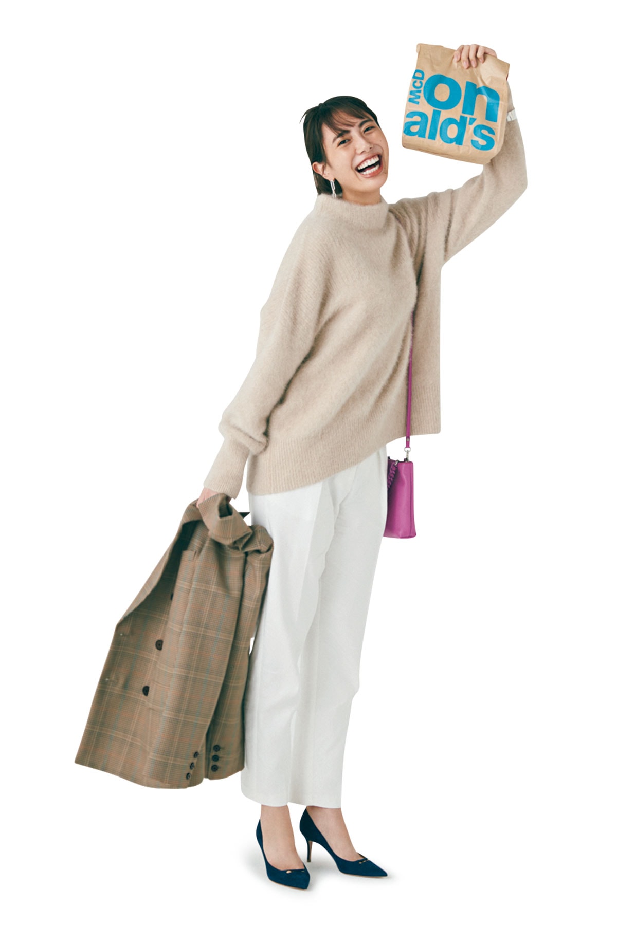 「見た目の印象がぐっと明るくなるピンクは、カジュアルなミドルゲージのニットで取り入れることで甘すぎ防止に」(西尾さん)¥42,900(スローン) -