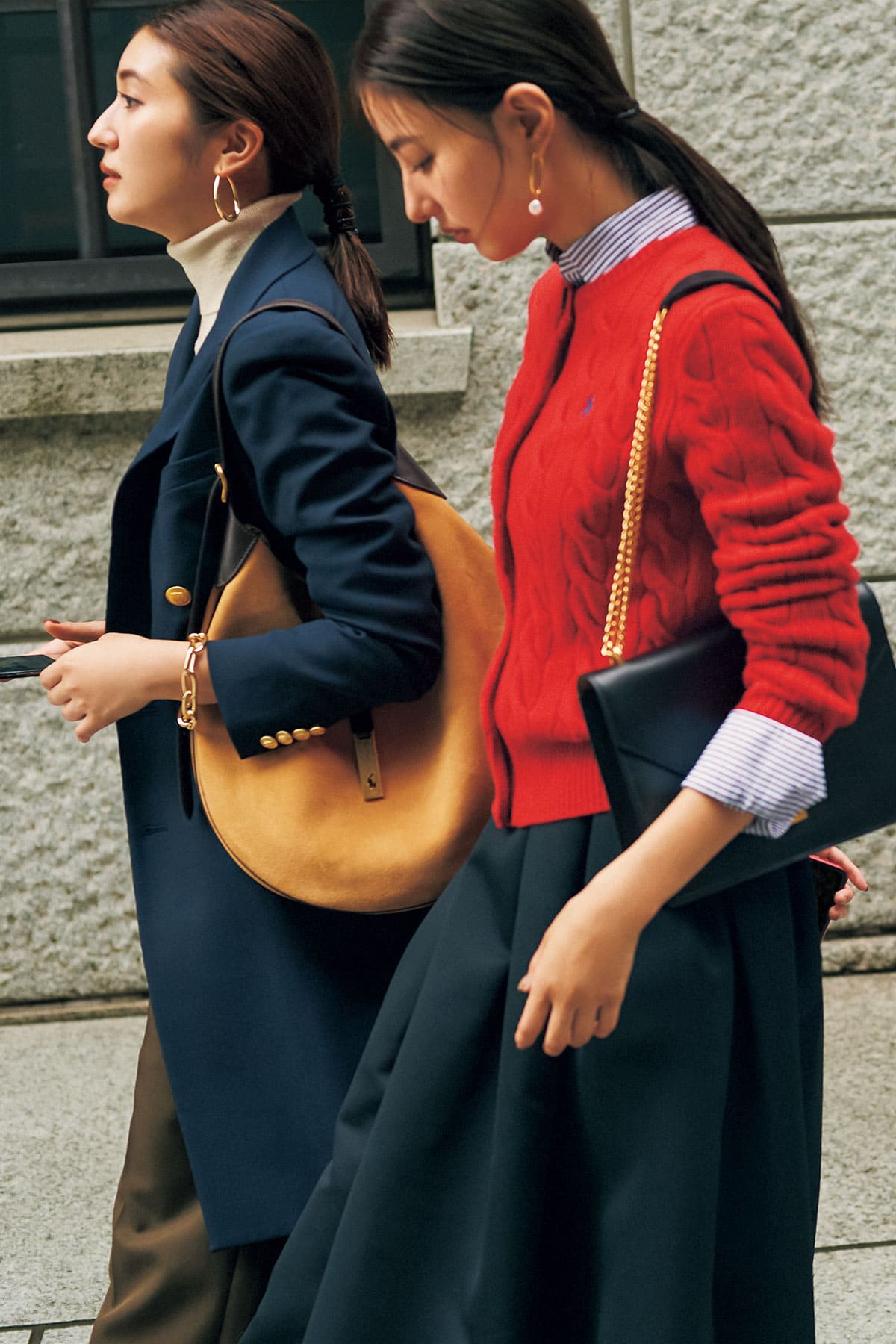 なかなかスイッチの入らない月朝は、着ている自分も周りもポジティブになれる色の力を借りるのもアイディアのひとつ。ケーブルカーデ+ストライプシャツのレイヤードでトラッドに寄せた着こなしなら、鮮やかレッドもオフィスで悪目立ちせずに大人見え。カーディガン¥35,200シャツ¥20,900バッグ¥75,900(すべてポロ ラルフ ローレン/ラルフ ローレン)スカート¥30,800(ツル バイ マリコ オイカワ)ピアス¥49,500(マリハ)