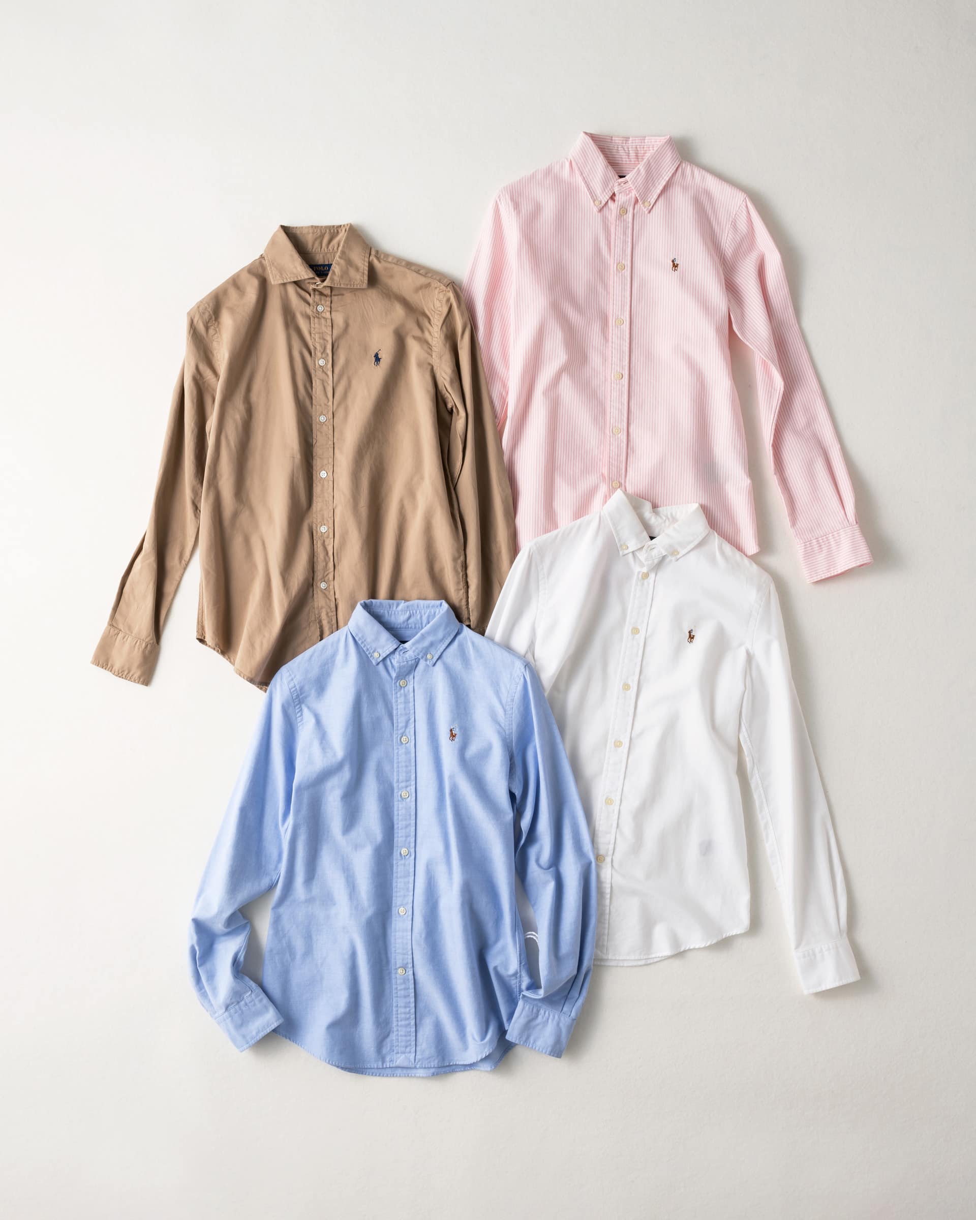 <右上から時計回りに>クラシックなボタンダウンタイプで甘口ピンクも大人。シャツ¥20,900、定番の白は、ニットやスウェットの重ね着にも使えて着回し力大。シャツ¥20,900、親近感がアップするブルーは、きちんとシーンでも頼りに。シャツ¥20,900、ほどよくゆるいシルエットで、ボトムスインでもアウトでもアレンジしやすい。シャツ¥20,900(すべてポロ ラルフ ローレン/ラルフ ローレン)